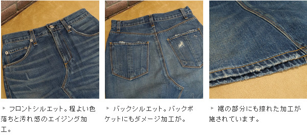 ダメージ加工が施されたデニムミニスカート。 色落ちや汚れ感、生地の擦れなど、エイジング加工が施されています。