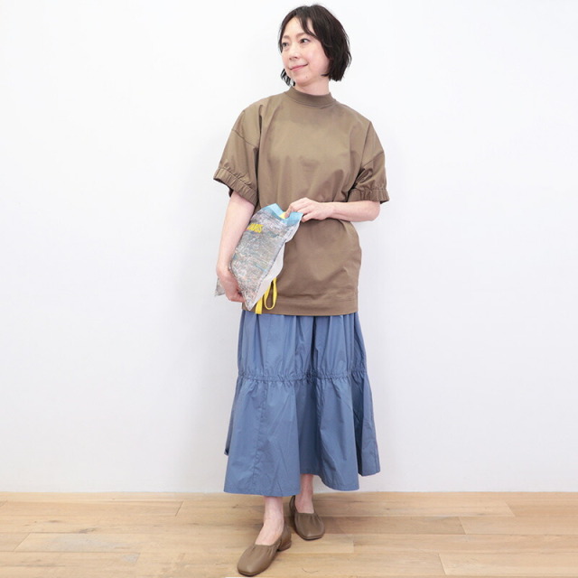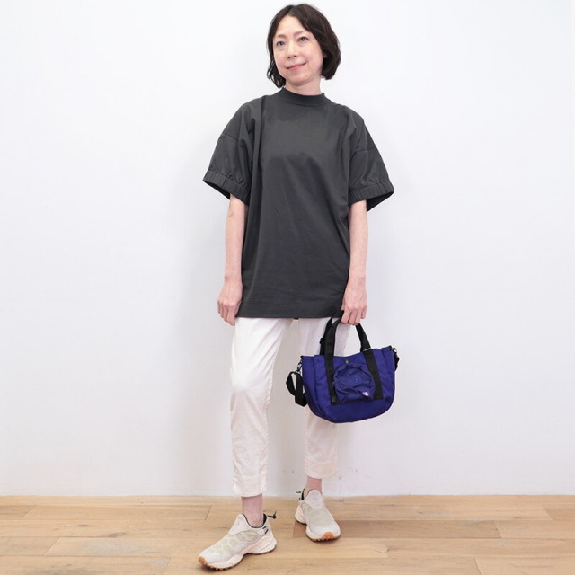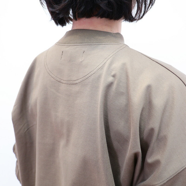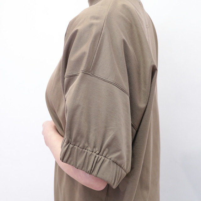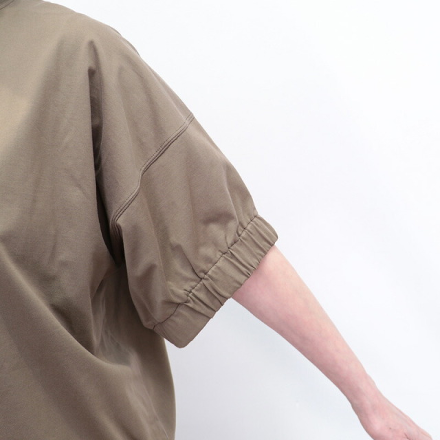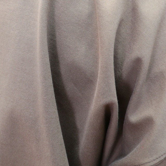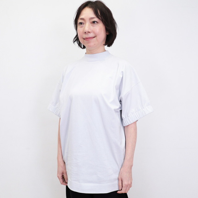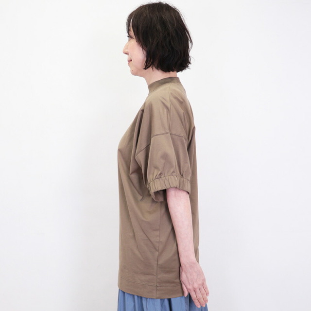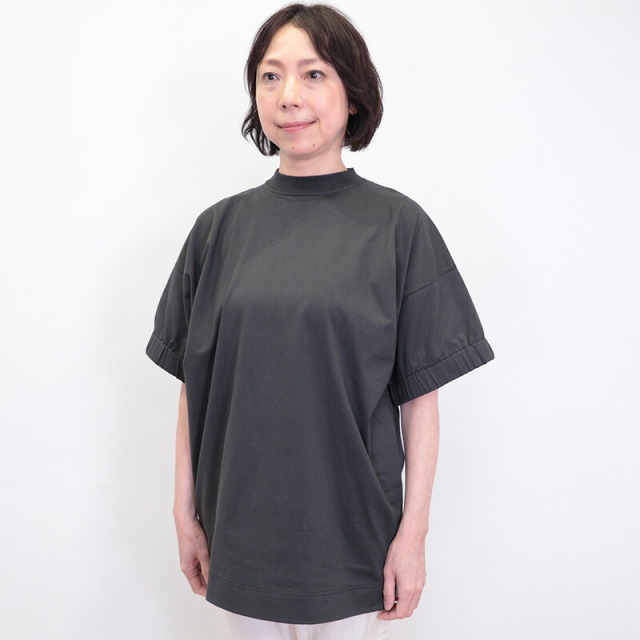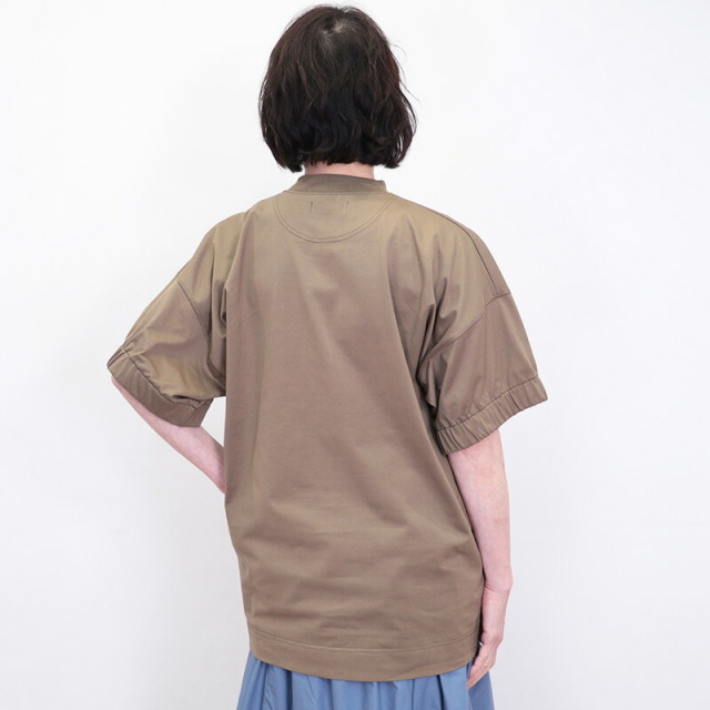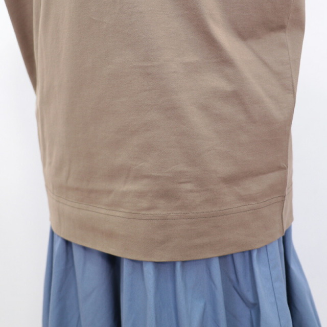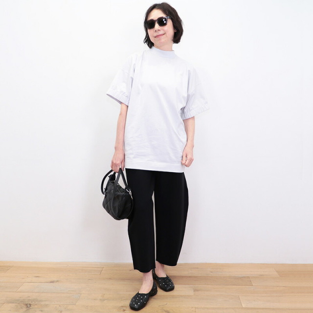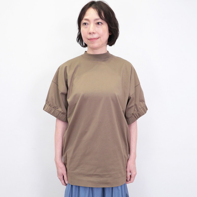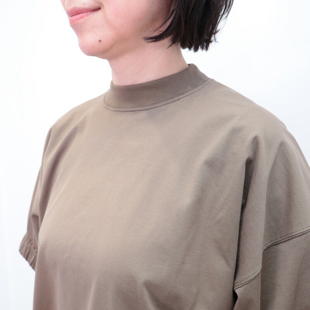 ラグジュアリーな素材、独自の立体的なフォルム、日常における着心地の良さを叶えたオーバーサイズのTシャツ。素材がしっかり厚手で張りと光沢があり、立体的なフォルムが出るのが特徴です。太幅で詰まった首元のリブと、袖口のシャーリングがアクセント。Tシャツのラフさを感じさせず、メインのカットソーとして一着で主役になるような存在感。ひと捻りあるデザインとニュアンスカラーは、大人の女性のTシャツコーデをランクアップさせてくれます。