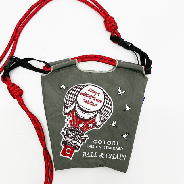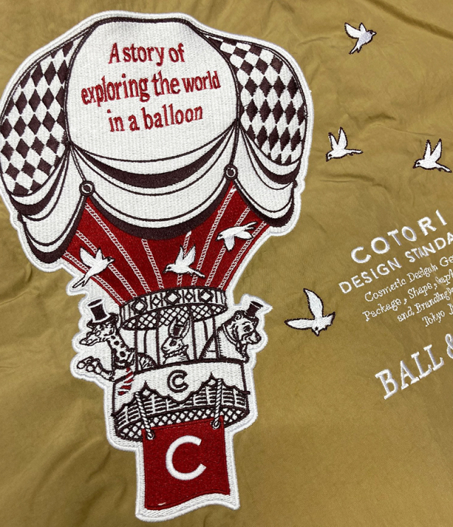 コトリデザインスタンダードとのコラボレーション。動物たちが気球に乗って冒険するポップなデザイン。落ち着いたカラーに、アクセント使いのレッドが効いています。