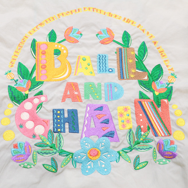 Ball&Chainのロゴをボタニカル風にアレンジした、ポップなフォントのデザイン。カラフルでコーディネートを華やかにしてくれます。