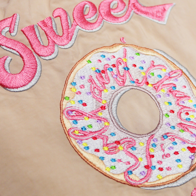 可愛らしいスイーツのデザイン。ドーナツのトッピングがリアルに刺繍で表現されています。