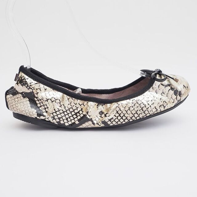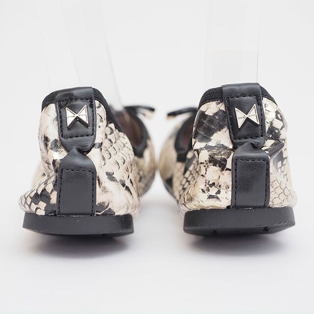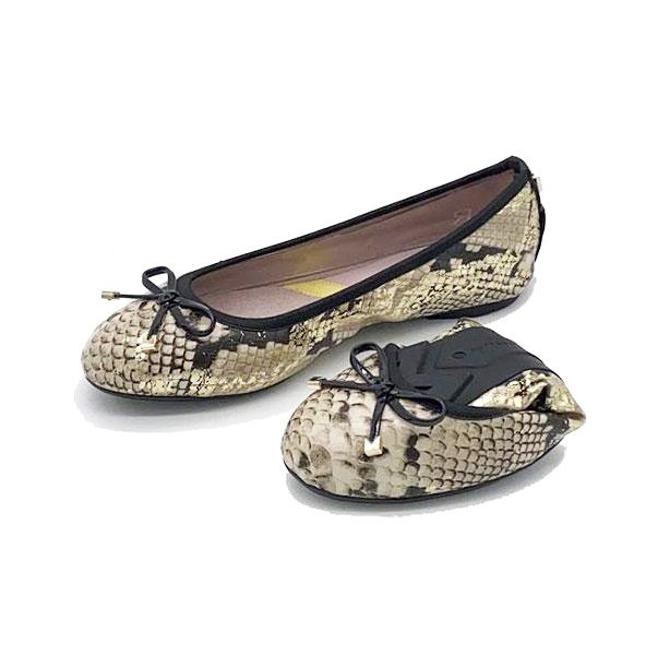 折りたたんで持ち歩きが可能なフラットパンプス。デイリーユースにも使えるパイソン柄で遊びのあるデザインです。つま先部のリボンがポイント。Butterflyはフェミニンで洗練された美しさ、常に進化と変化を遂げていくイメージから、Twistsは靴が折りたためるというユニークで革新的なアイディアを象徴しています。ロンドンの街中では、女性の大半が履いているというほど大人気なポケッタブルシューズ。驚きのコストパフォーマンスにも注目!