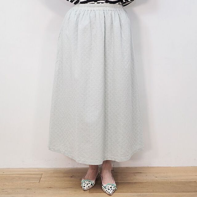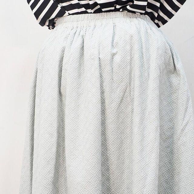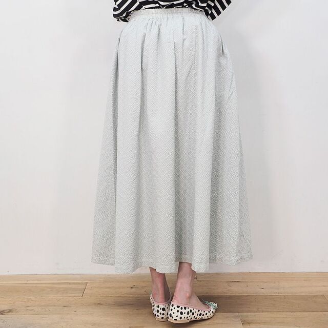 細かい刺繍でレース模様をデザインしたコットン素材のフレアスカート。全体に刺繍が入ることで生地がしっかりとして、しわになりにくく透け感もないところが履きやすさのポイント。生地にハリが有る為、きれいなフレアの形が保たれ、コーディネートのバランスもグッド◎。