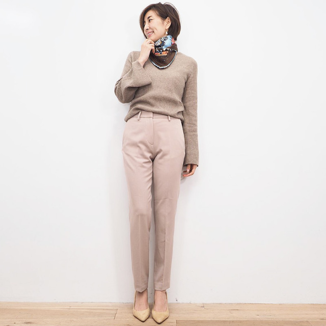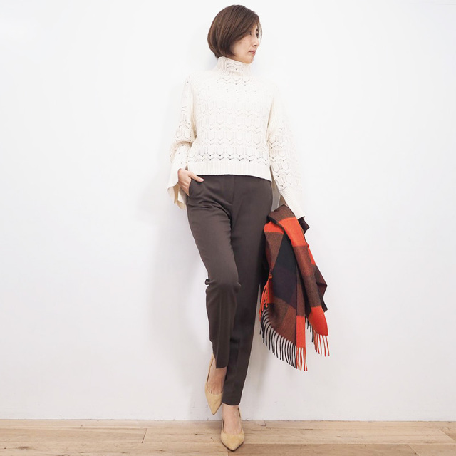 ストレッチ入りのポリエステル素材で、通年活用できる素材感です。今シーズントレンドのオーバーサイズな厚手ニットと合わせて、細身のパンツは使えること間違いなし。