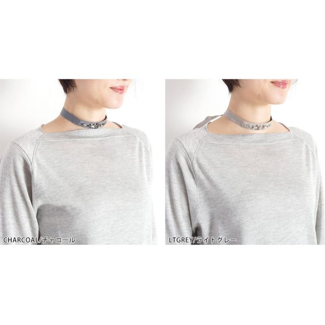 首元を華やかに演出してくれる、グログランリボン×ビジューチョーカー。結ばずに左右のリボンを引っ張るだけで、簡単に長さ調節ができるアイテム。太めのベルトは、後ろから見ても可愛いデザインで「CITRUS]のチャームもついています。合わせる洋服によってカジュアルにもパーティースタイルにも活躍してくれる相性の良いアクセサリー。さりげないアクセントになるチョーカーは今年のマストアイテムです。カラーは、「CHARCOAL」「LTGREY」の2色展開になります。