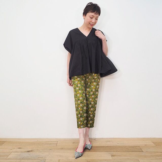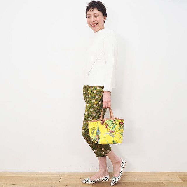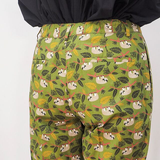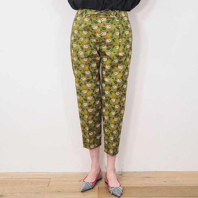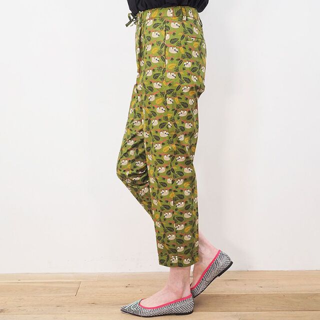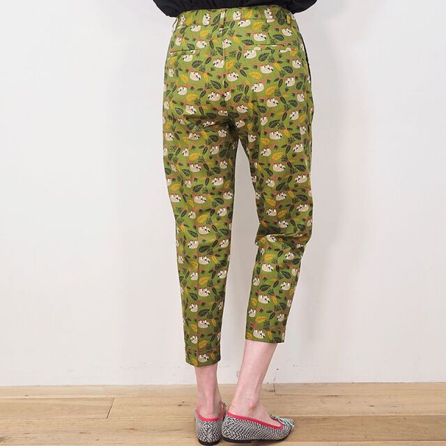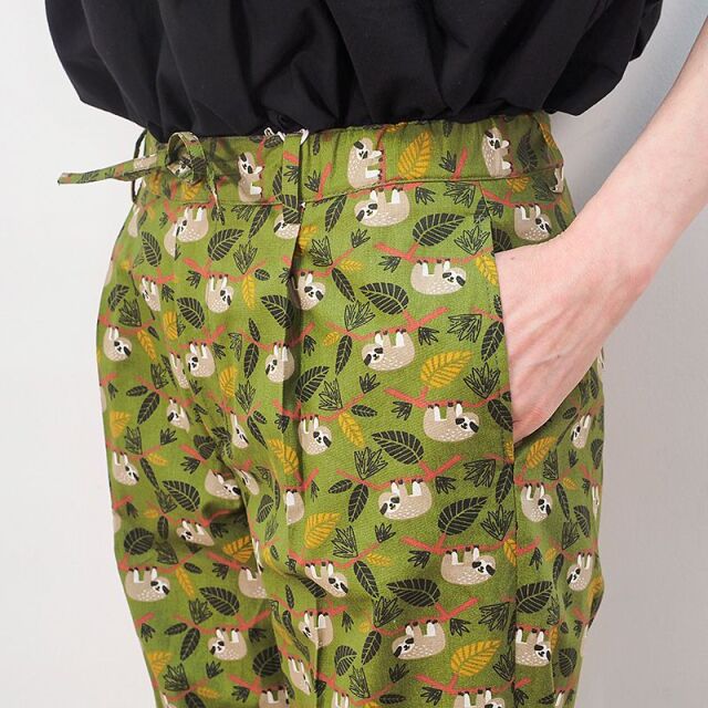 思わず人に見せたくなるような、可愛らしいナマケモノ柄がチャーミングなパンツ。シルエットはクロップ丈でスッキリとしていて、サンダルやスニーカーと合わせてもカジュアルになり過ぎないデザイン。シンプルなブラウスやシャツなどに合わせれば、さり気ない遊び心が引き立ちます。