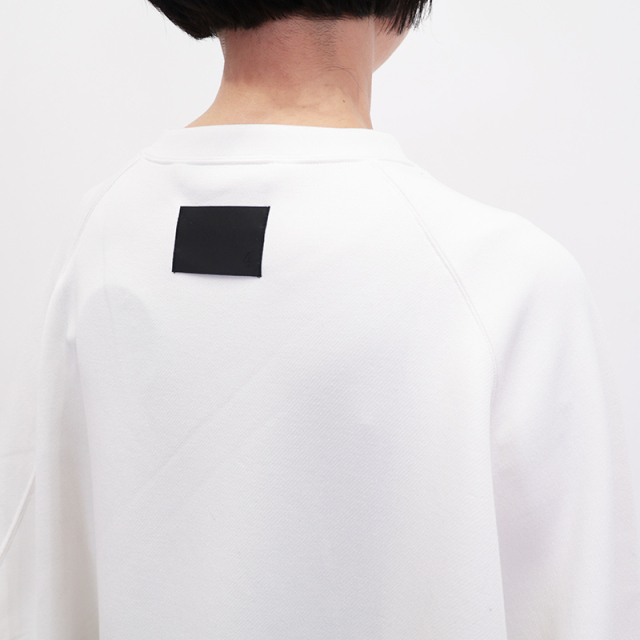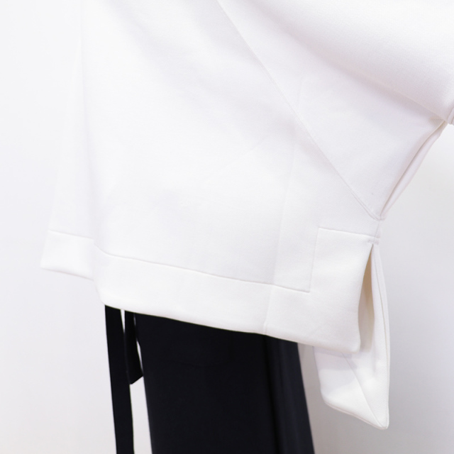 裾に深いスリットを入れ、横姿が特徴的なスウェットプルオーバー。COGの定番シルエットであるワイドな身頃と小ぶりな袖に、たっぷりとタックを入れたバックデザインが特徴です。 深めのスリットがユニークなシルエットを作り出し、細身のパンツだけでなく、ワイドパンツやスカートとも相性抜群。 ツイル調の綾組織が上品な、段ボールニット素材を使用しています。 程よいストレッチ製とフォルムを保つエアリーな張り感が美しいシルエットを作り出します。 表面の綾組織が綺麗めな印象を与える素材です。