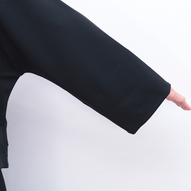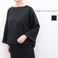 横に広く開いた襟ぐりとワイドな袖がエレガントな雰囲気のプルオーバー。やや短めの丈はワイドトラウザーズやロングスカートなどと相性がよく、裾のタックにより自然に膨らんで後ろ下がりになる構築的なシルエットがCOGらしいデザインです。 クールでドライなタッチの表面と、柔らかで温かみのある微起毛のチャコールグレーの裏面のダブルフェイス仕様。 しなやかなジャージーならではの伸びの良さと、二重構造による程よい張りが綺麗めな印象を与え、存在感抜群です。 クールな表情ながら、肌触りが温かく伸縮性があり、着心地が良いのが嬉しいポイントです。