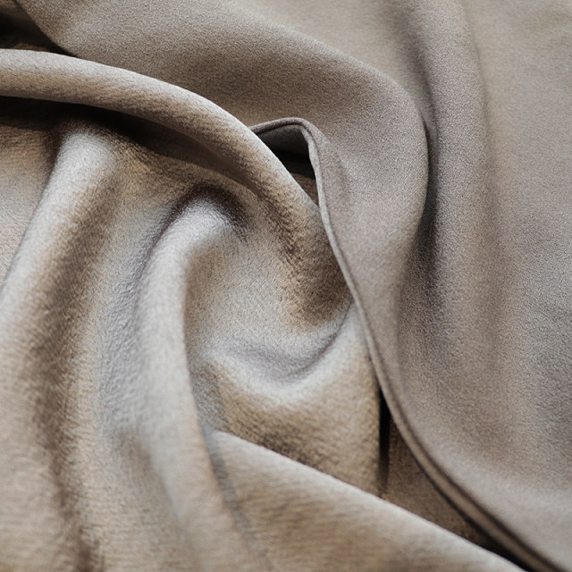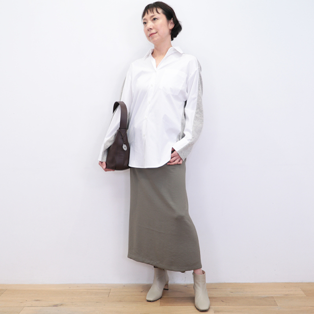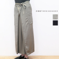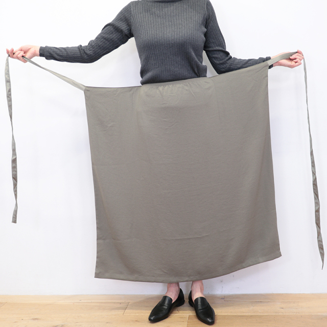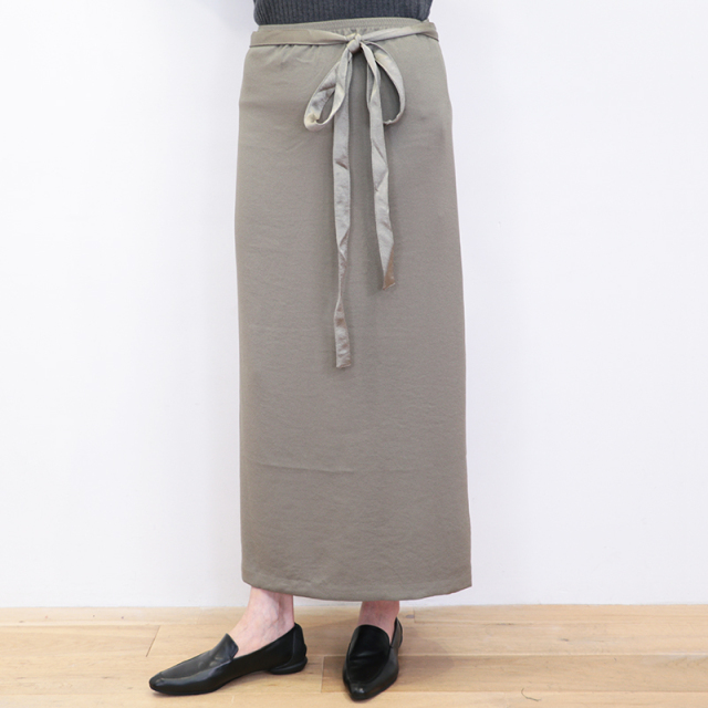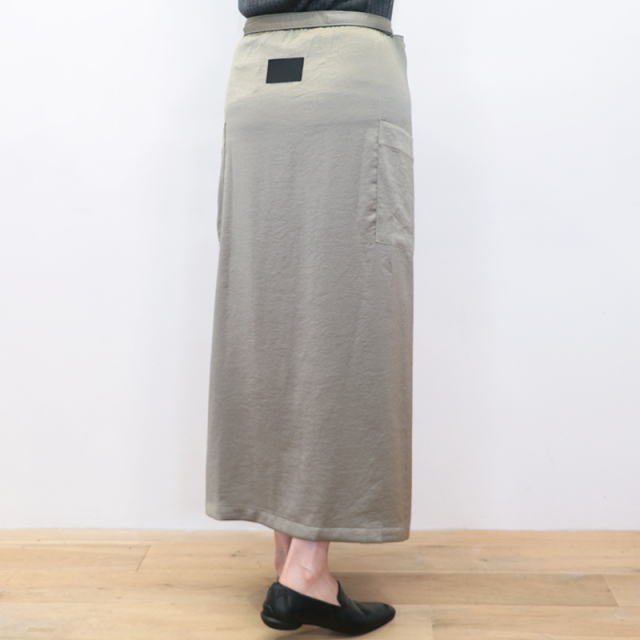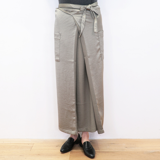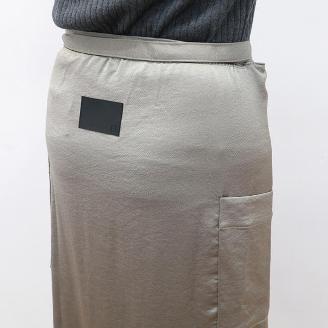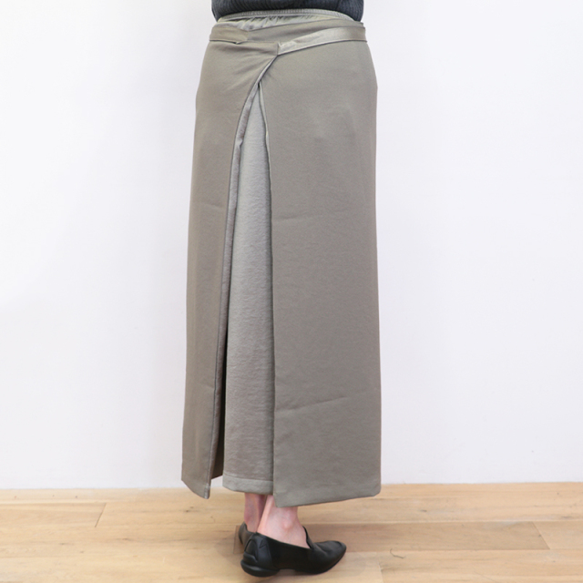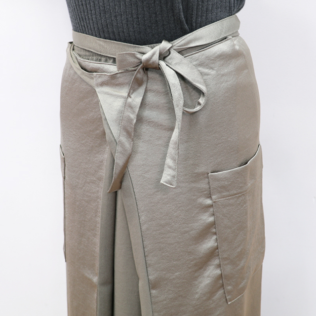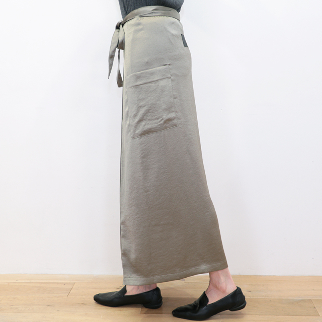 前後に生地の表情の違う光沢のあるサテン面とジョーゼット面を使い、巻き方により3通りの着こなしが楽しめるスカートです。 ポケットのあるサテン側を前でクロスしたり、そのまま後ろでクロスするとジョーゼットのシンプルなタイトスカートのようになります。 スカートを前後回転させてジョーゼット面を前でクロスすれば、歩く度にラップ部分から覗くサテンがデザインのポイントになります。素材には100%リサイクルポリエステルを使用。経糸にはシルクのような光沢の糸を使用し、横糸に伸縮性のある糸を使用することで、表裏の表情が違う独特の風合いが特徴の素材となっています。