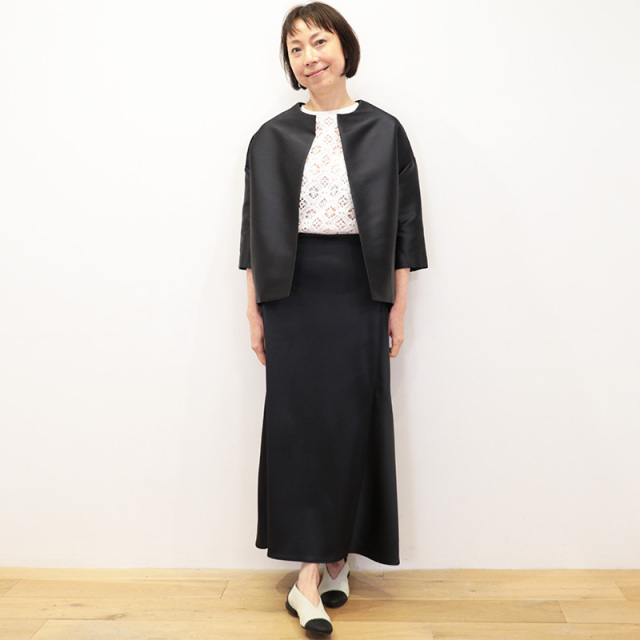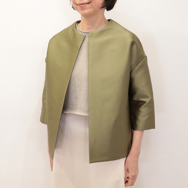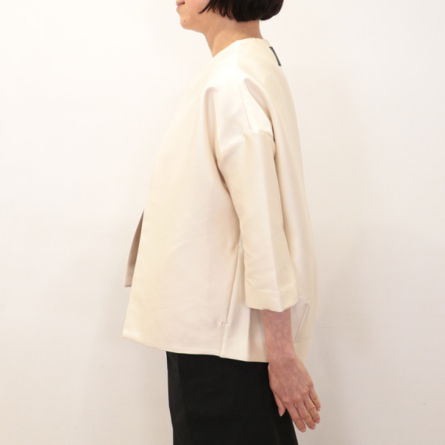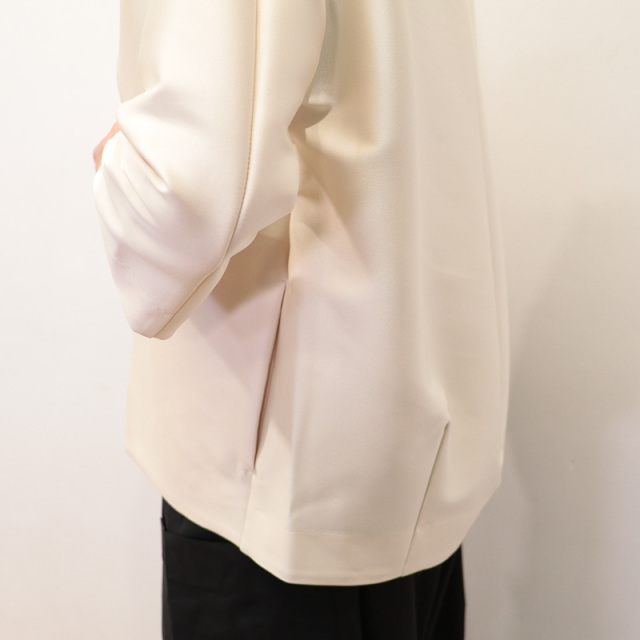 60年代のクチュールジャケットを思わせるような、エレガントで立体的なフォルムが印象的なノーカラージャケット。 背中のセンターに深いタック、裾にはダーツを配し、後ろ姿にドラマチックなボリュームを生み出しています。 極限まで削ぎ落とされたミニマルなデザインが、洗練された佇まいを際立たせます。 Tシャツやデニムにラフに合わせても、軽いオケージョンにも対応できる、シーンを選ばない一着です。 フォーマルウェアやクチュールで用いられるダッチェス・サテンをイメージして作られた、高密度でしなやかなストレッチ素材を使用しています。 美しい光沢と程よい横張りが特徴で、ボリューム感のあるシルエットにもよく映えます。 カジュアルなデザインにあえてこの上質なサテンを組み合わせることで、上品さと存在感がアップします。