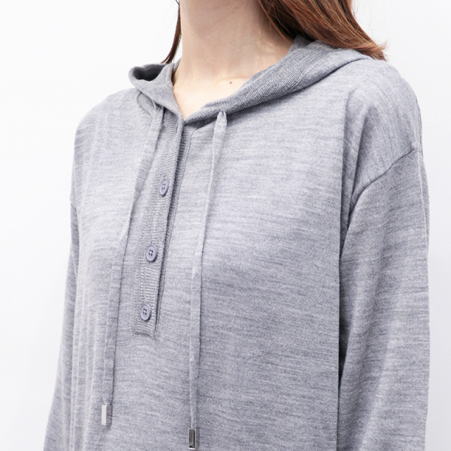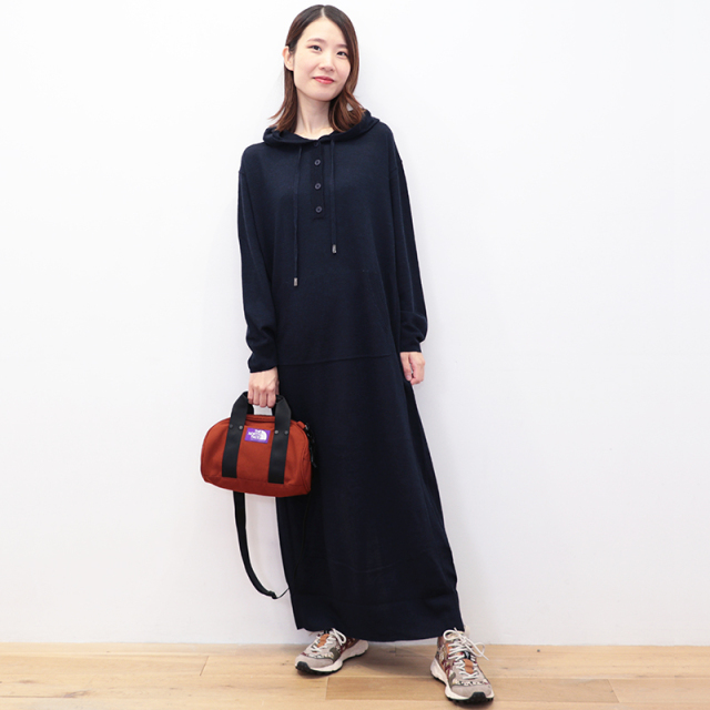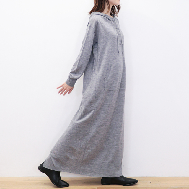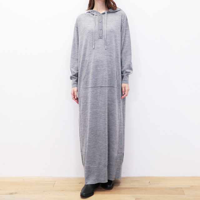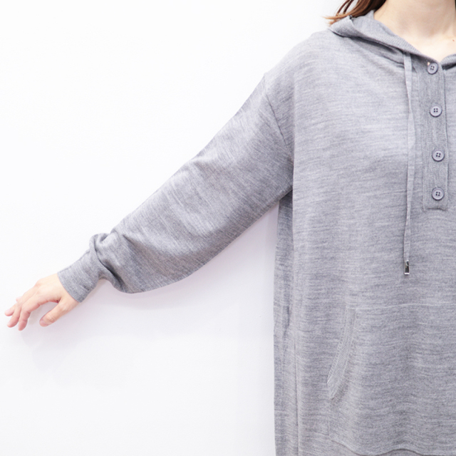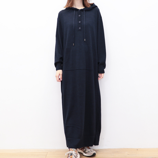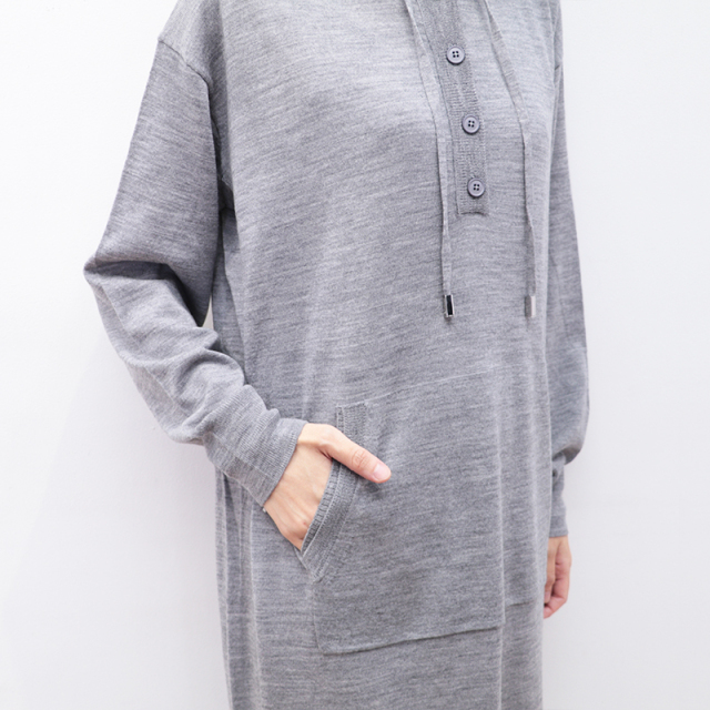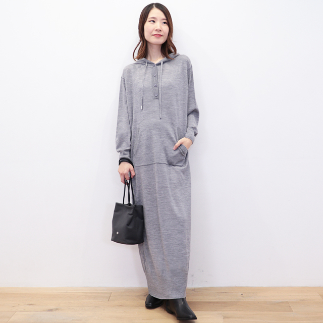RWS認定のウール素材を100%使用したパーカーワンピース。ハイゲージのスムースな表面感で、チクチクせず肌触り抜群。ゆったりとしたシルエットに、フードやドローコードのついたデザインで、リラックス感があり優しい印象です。静電気防止加工が施されていたり、ハンドウォッシャブルなところもデイリーユースしやすく嬉しいポイントです。今シーズンは深みのあるネイビーカラーも登場。カジュアル過ぎず、シックで落ち着いた印象にもコーディネートできます。
