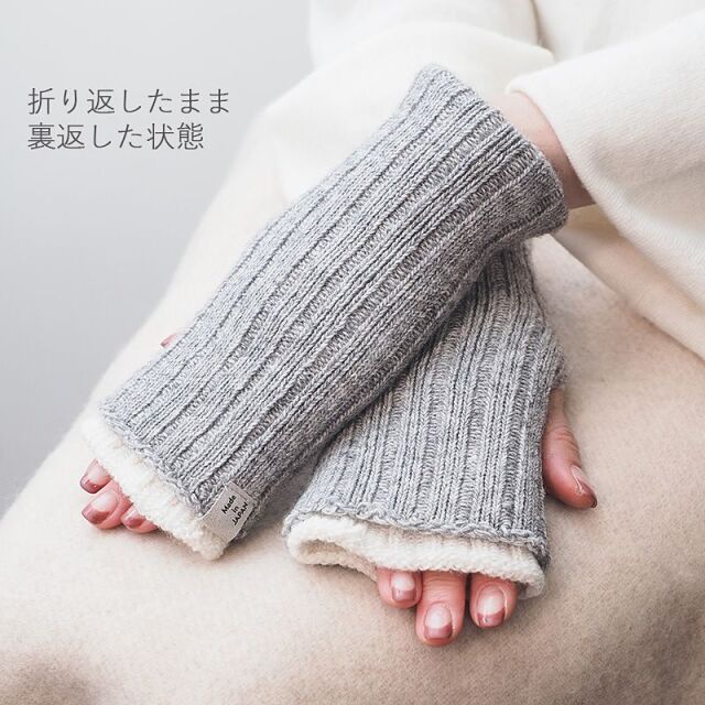 スマホやPC、日常生活で手を使う際に着用したままでOK。フィンガーレスのアームウォーマーです。二重に折り返すとショートグローブに、伸ばすと腕まで暖かいアームウォーマーに。また、裏返したり上下を逆にすることで、4通りのデザインが楽しめます。機能性だけでは無くデザインも考えられた優秀アイテムです。
