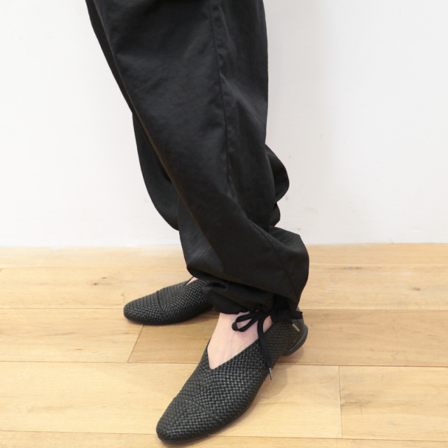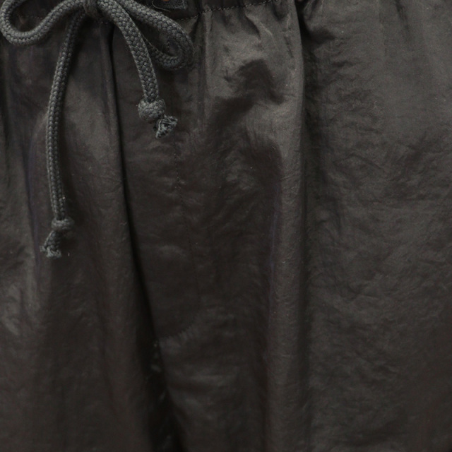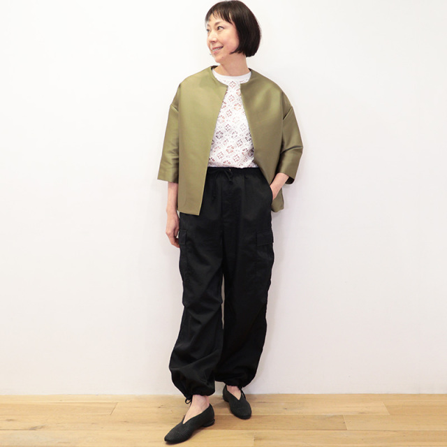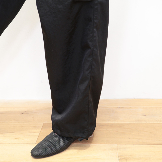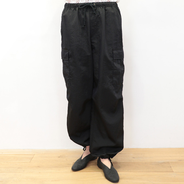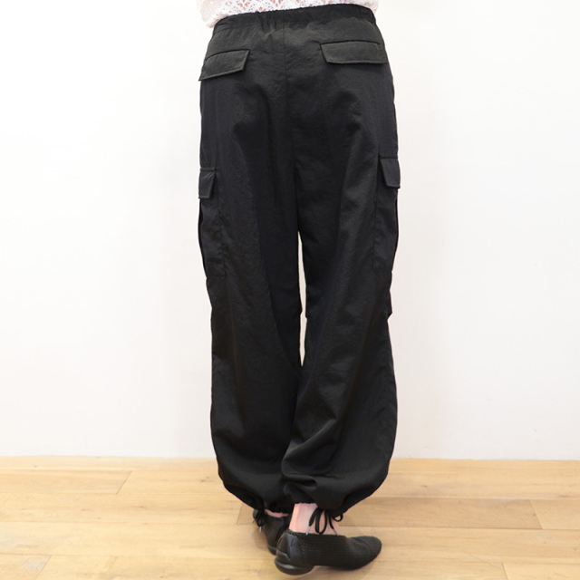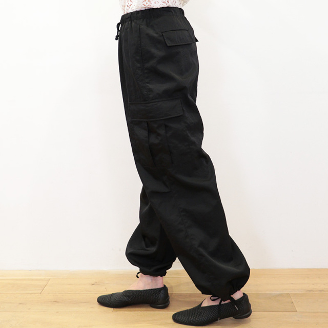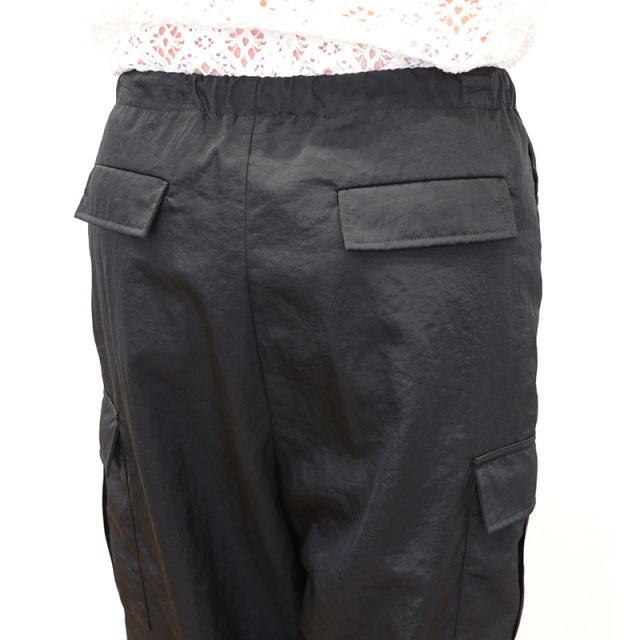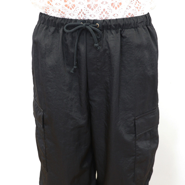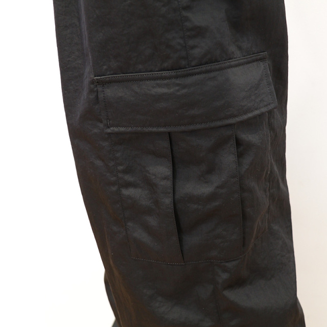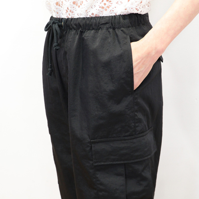 ナイロン素材で生地表面にやや光沢のあるカーゴパンツ。モードにもカジュアルにも使えるオールマイティなブラックをつくりました。一般的な綿素材のカーゴパンツよりも綺麗めな印象で、大人の女性のデイリーコーデにおすすめなボトムスです。ウエストにはドローコードと別にゴムも入っている為、適度なフィット感があります。また裾幅はドローコードで調節可能で、引き擦る心配がなくシルエットもアレンジ可能。様々な体型の方に着用いただけます。