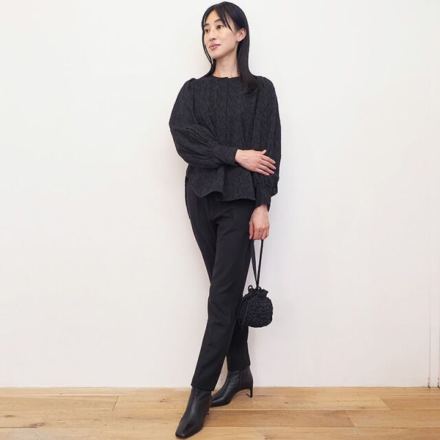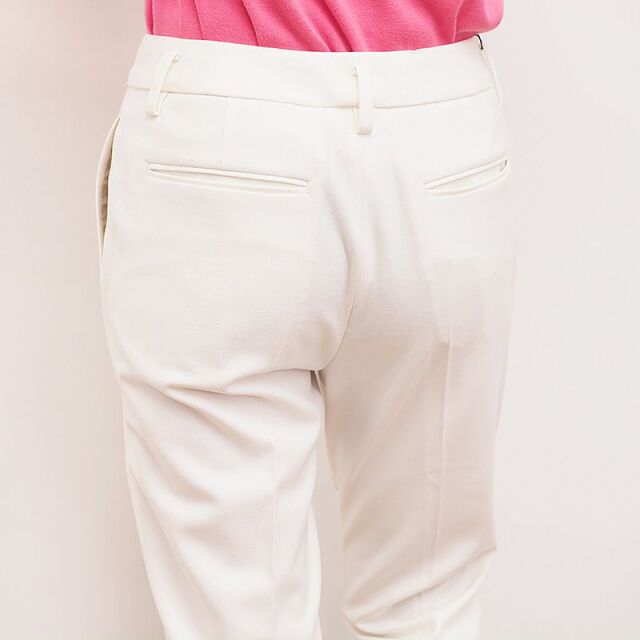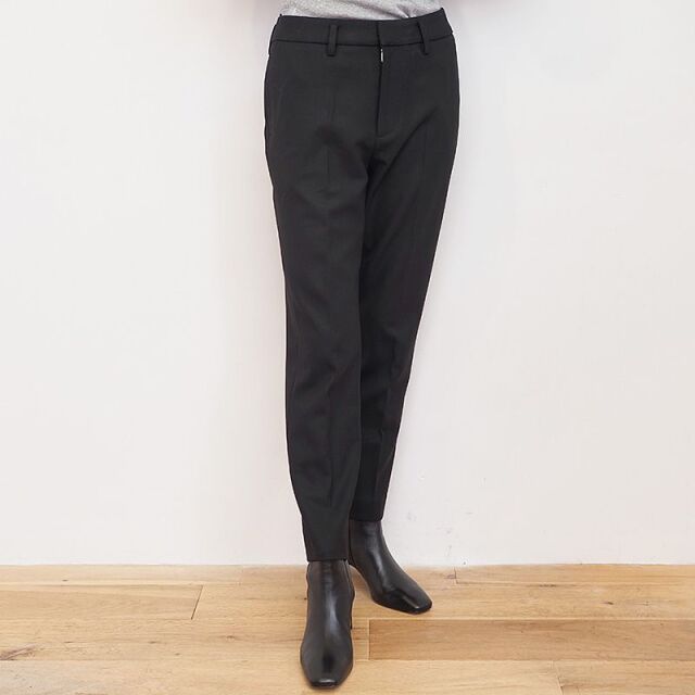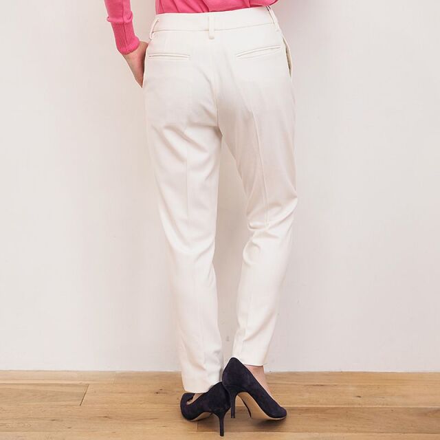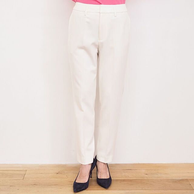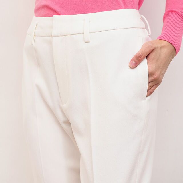 センタープレスで裾にかけて足が細く見え、綺麗めな印象のパンツ。スラックスのようにきちんと感があります。日本人の体型に合わせたメイドインジャパンの設計。ウールライクなきちんとした印象の表面感ですが、レーヨンやポリエステルをベースにしており、敏感肌の方にも快適な着心地。ご自宅で洗濯可能なところも嬉しいポイントです。