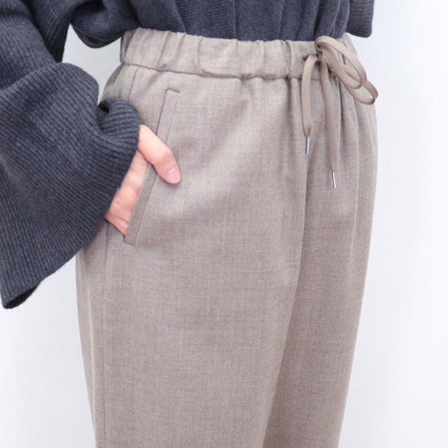 ウールサキソニー素材できちんと感のあるワイドパンツ。ウエストゴムで着心地楽々ながらもスラックスの様に綺麗見えする優れもの。厚みのない生地は嵩張らずに早い季節から着用でき、見た目よりも軽快な履き心地です。グレーはアプトの別注カラー。どのカラーもベーシックで使いやすく、コーディネートに活躍すること間違いなしです。