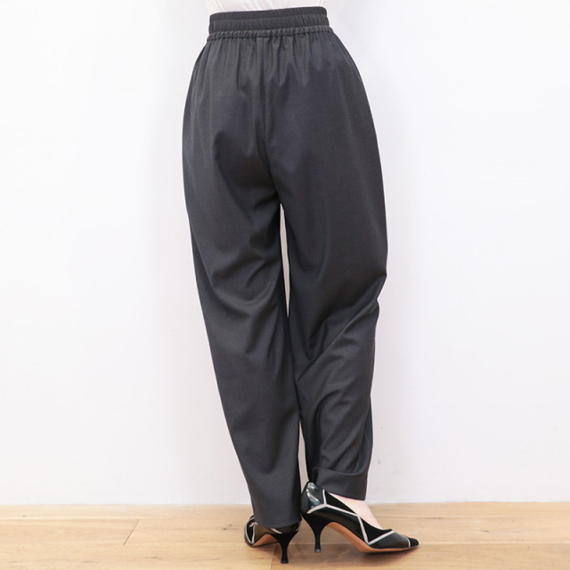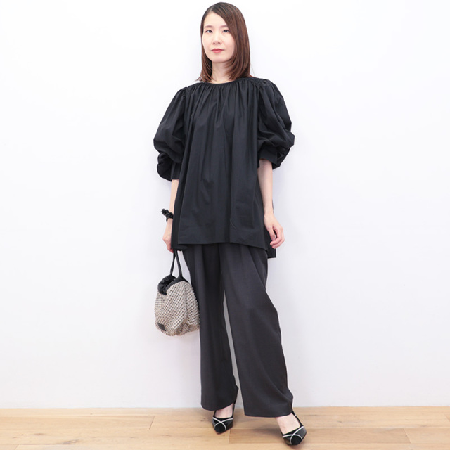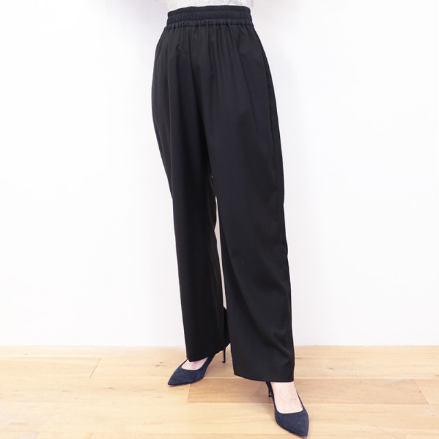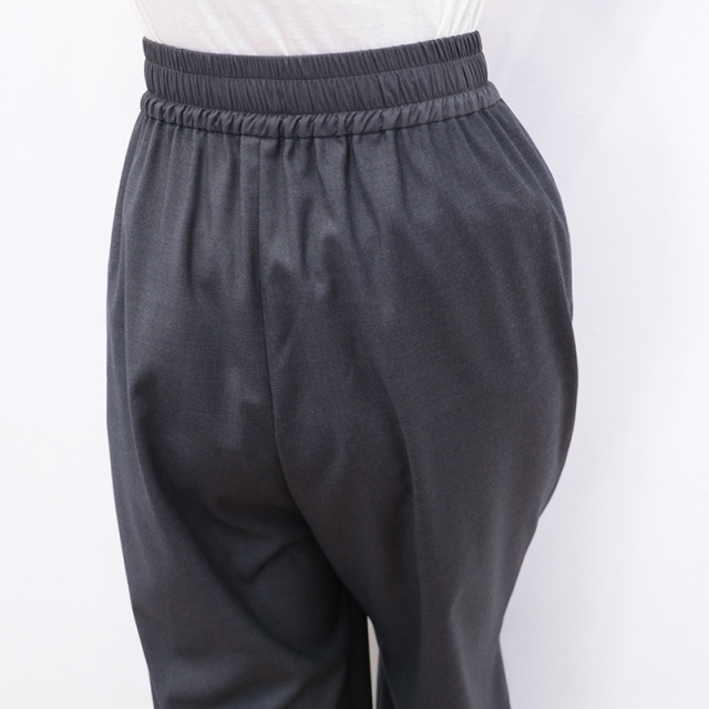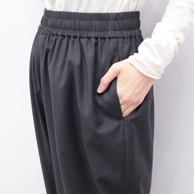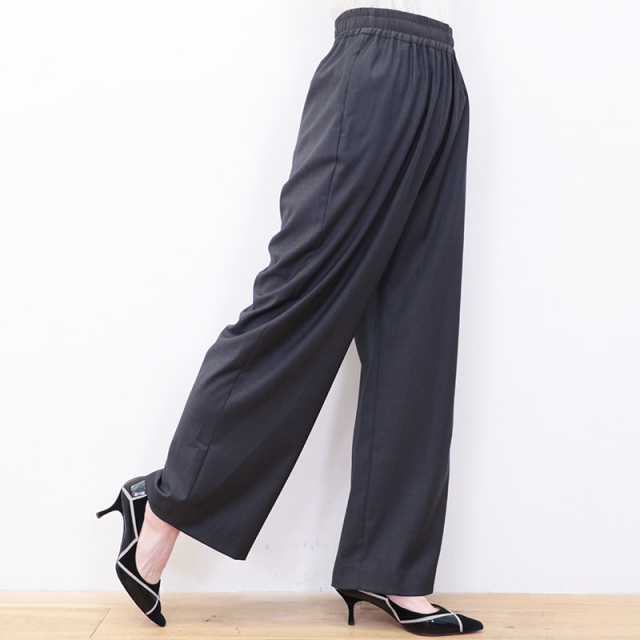 一見ウール素材に見える滑らかな生地を使用したワイドパンツ。ポリエステル×レーヨンをメインに作られたこの生地は、やや光沢があり高級感のあるしなやかさが特徴です。見た目がウールでも無配合なので、チクチクせず素足でも快適な履き心地。透け感はなく薄手なので、オールシーズン活用いただけます。ウエスト部分は生地を切り替え、トップスをタックインしてもデザインがあるように、細かなところも美しく仕上げられています。細やかに施されたウエストまわりのタックと落ち感のある生地で、比較的わたり幅が広めでもワイドに見え過ぎず、スラックスの様に綺麗で上品なスタイリングを叶えてくれます。