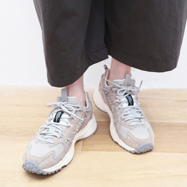 太さの異なる2種類のレースを使用した無骨なデザインが特徴の YAMABUSHI。ボディーにはナイロンを使用し、オーバーレイのレザーと組み合わせることで、足のブレによる衝撃を効果的に軽減する構造となっています。はるか昔から穏やかに暮らし、そして谷を渡り、山々を駈ける「山伏」 。そんな日本文化に敬意を表したプロダクトです。新ソールは接地面にフロント、ミッド、リアの3つのセクションに異なるラバーを配し、各セクションに独自の機能を搭載しています。