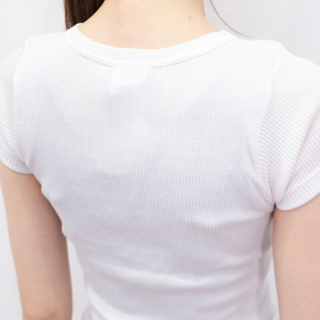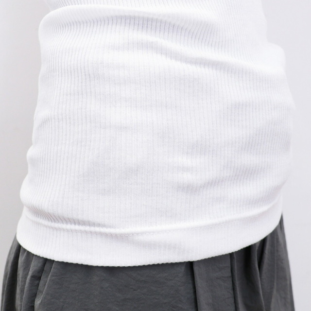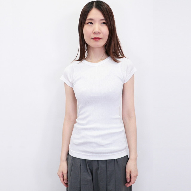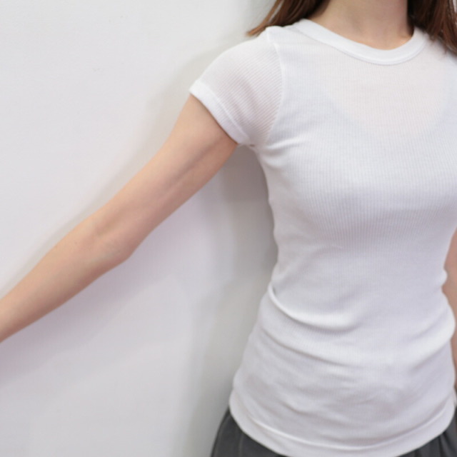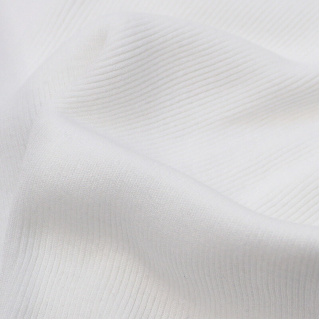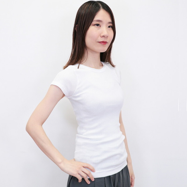 柔らかく、非常に伸びの良い上質なコットンを100%使用したリブTシャツ。脇の縫い目がない丸胴リブ編みによる心地よいフィット感が特徴です。やや詰まったネックラインとスッキリしたシルエットで女性らしく着こなせます。素材には、細番手の双糸(2本取り)に糸の段階でシルケット加工を施している?スコツィア糸?を使用。単糸(1本) のものよりも強度が増し型崩れしにくいのが特徴です。また、通常は生地の状態で行うシルケット加工を糸の段階で施すことで、さらに光沢のある高級感漂う表情に仕上がっています。ドライタッチで汗ばむ季節も快適にお過ごしいただけます。