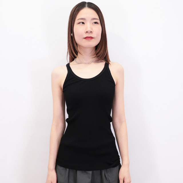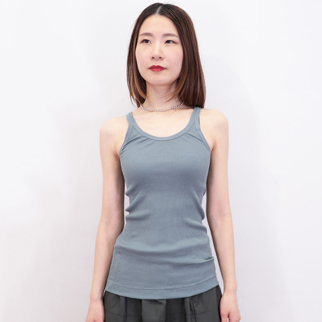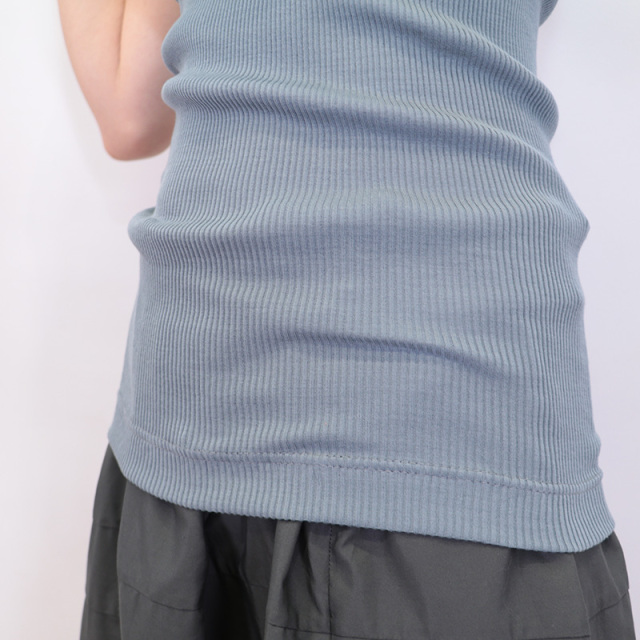 丸編みの生地を使用しているので脇の縫い目がなく、インナーに着心地の良いアイテム。透け感のあるシャツやカットソーをすっきりキレイに着こなすための脇役としてもおすすめです。柔らかく伸びの良い上質なコットン100%の素材を使用しているので肌触りがよく、リブ編みによるインナーとしての心地よいフィット感もあり着心地抜群です。細番手の双糸(2本取り)に糸の段階でシルケット加工を施しているスコツィア糸を使用。編地にシルケット加工したものよりも、さらに光沢がある仕上がりが特徴です。表面の産毛を予め取り除いているので肌触りが良く、単糸(1本) のものよりも強度が増し型崩れしにくい嬉しいメリットも兼ね備えています。