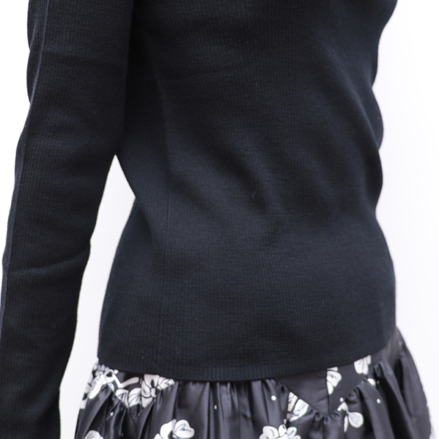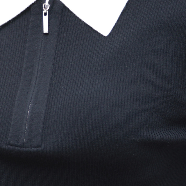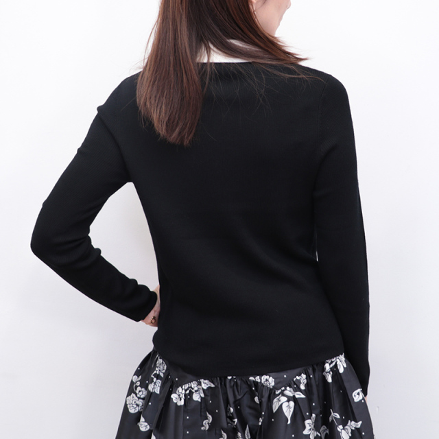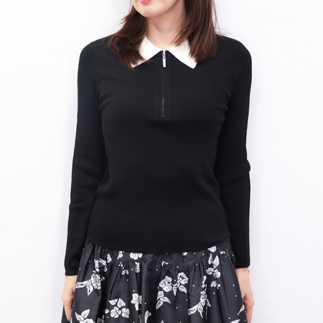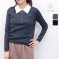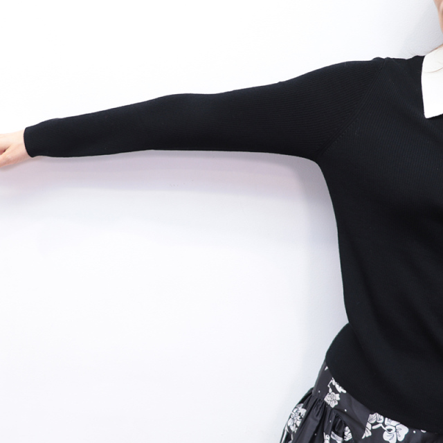 季節の変わり目に重宝するハイゲージリブニット。大きめの白襟をドッキングしており、フレンチシャツのようにきちんと見えする一着です。首の開き具合はファスナーで調節できるため、抜け感を出してラフに着るのもOK。着ぶくれしない為、ジャンパースカートやオールインワン、ジャケットやカーディガンのインナーにも便利。薄手でスムースな表面感ですが、ウールを100%使用している為、他の素材に比べて保温性が高く、秋冬は心強いアイテムです。