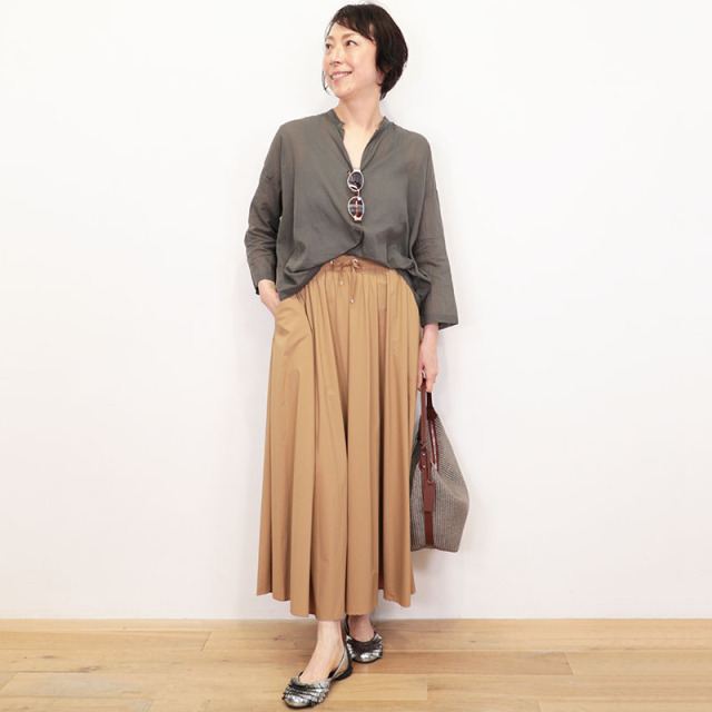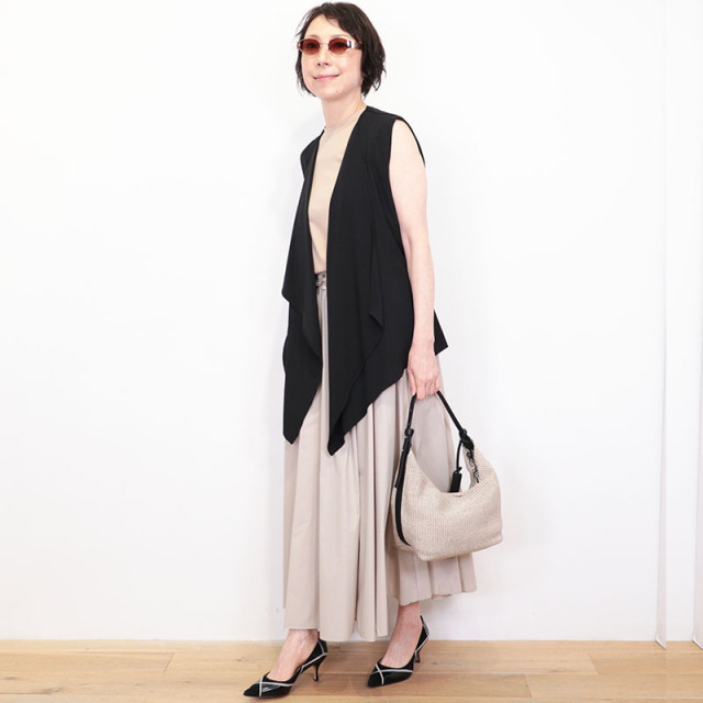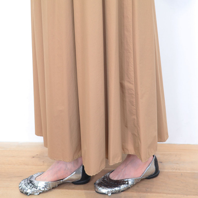 【LIGHT NYLON STRETCH】という、ドライタッチで薄く柔らかい質感の新素材を使用しています。ポリウレタンの混紡率が高いストレッチナイロンで、軽量で柔らかな生地感に加え、耐久性と撥水性があり機能的。光沢を抑えた上品でマットな色味が特徴です。シルバーのパーツが映えるクラス感のある仕上がりにもなっており、スポーティーさは抑えられエレガントに着ていただくことが出来ます。サラッとした肌当たりが心地よく、春~梅雨の蒸し暑い時期でも快適に着用出来ます。