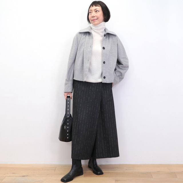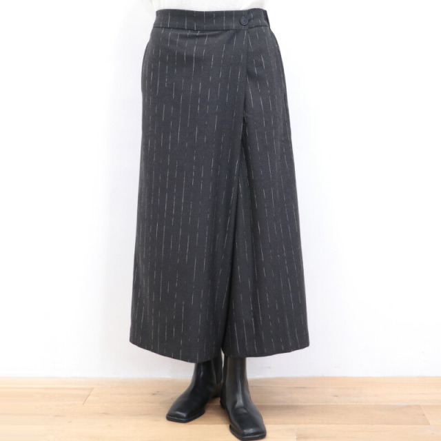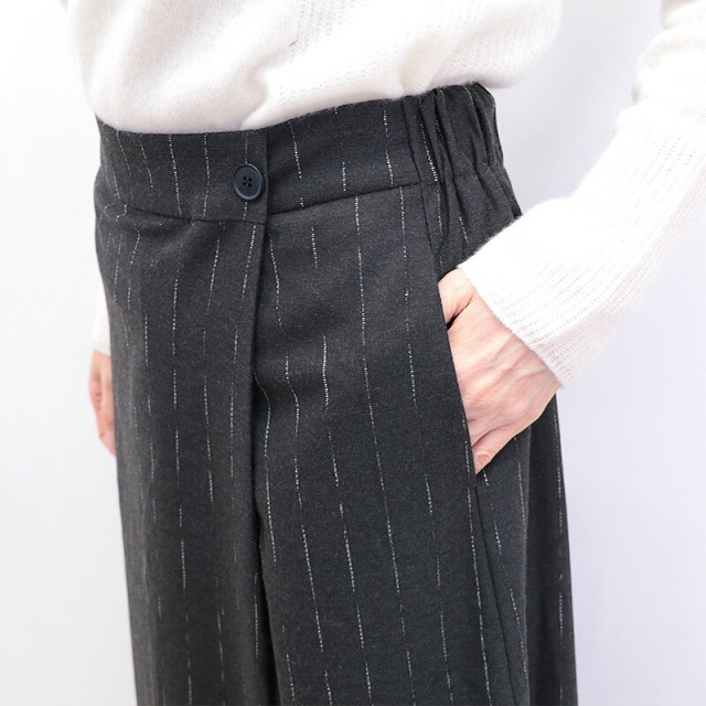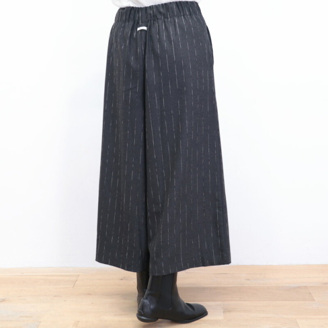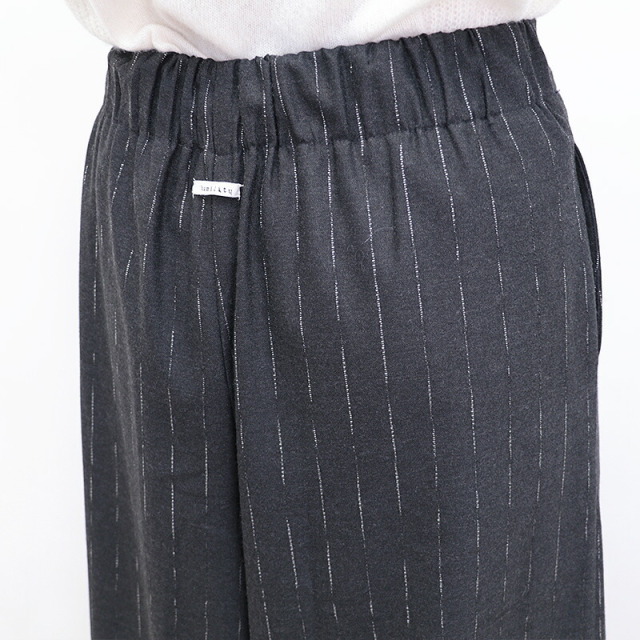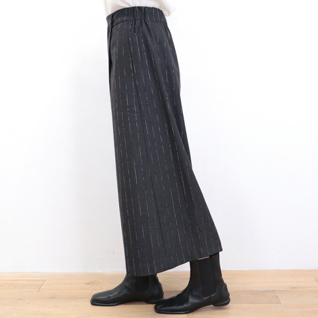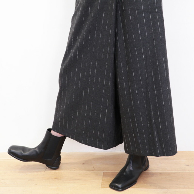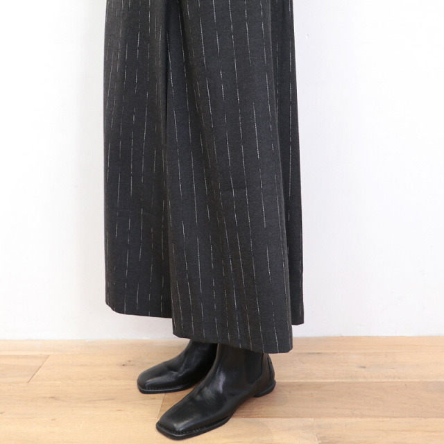 手書きのようなチョークストライクのワイドパンツ。ポリエステル、レーヨンをメインに作られたこの生地は、やや起毛感があり暖かみのある見た目が特徴。見た目がウールでも無配合なので、チクチクせず素足でも快適な穿き心地。ウエスト部分はタックを取り生地を合わせ、トップスをインしてもデザインがあるように、細かなところも美しく仕上げられています。このウエストまわりのタックとストライプのデザインで、比較的わたり幅が広めでもワイドに見え過ぎず、スラックスの様に綺麗で上品なスタイリングを叶えてくれます。ご自宅で手洗い可能なところも嬉しいポイントです。