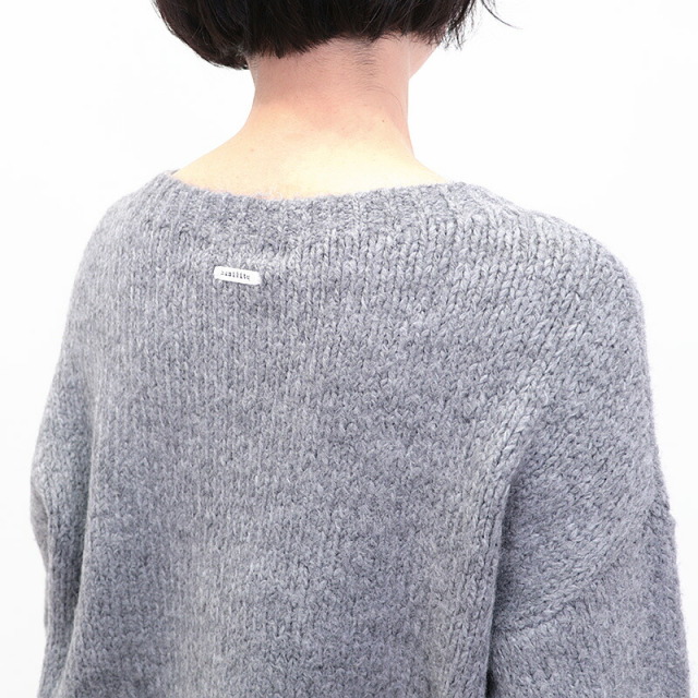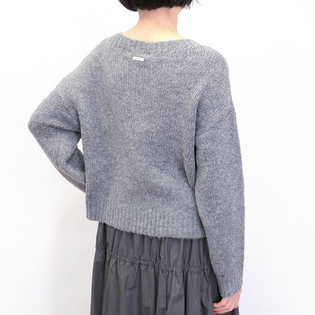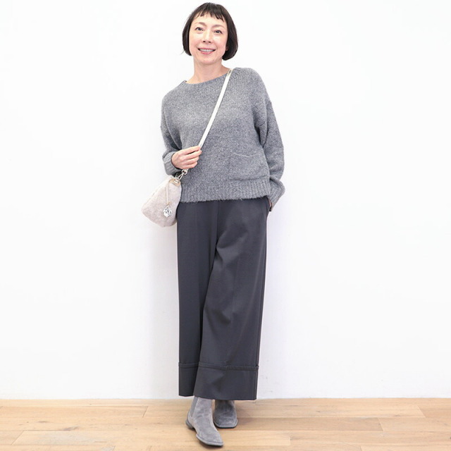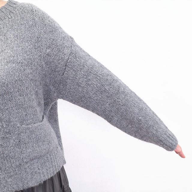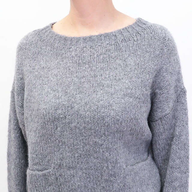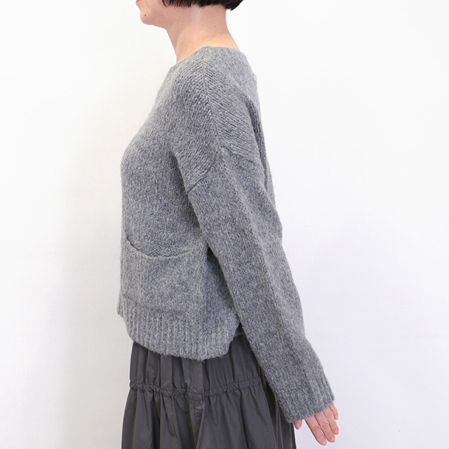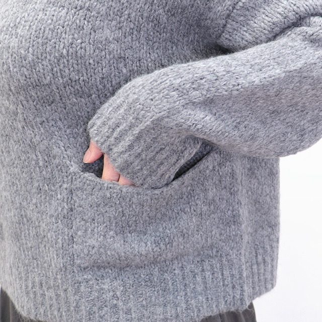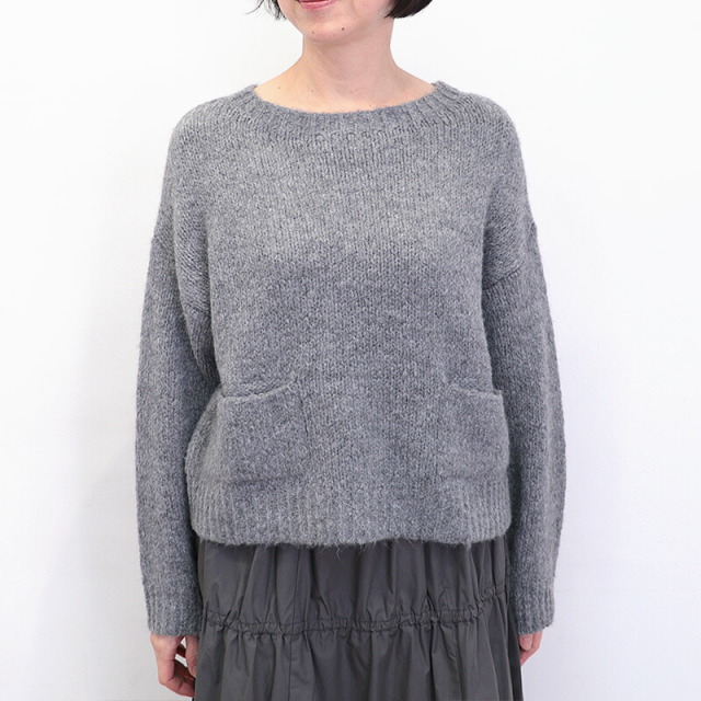 シンプルなグレーのニット。短めの着丈とワイドな身幅、長めの袖のバランスが絶妙でリラックス感のあるデザイン。ポケットが可愛らしく、無地のニットのアクセントになっています。モヘヤのように起毛感のある糸で編まれており、空気を沢山含んで暖かく柔らかい着心地です。リラックス感はそのままに、スウェットよりも綺麗目に合わせていただけます。