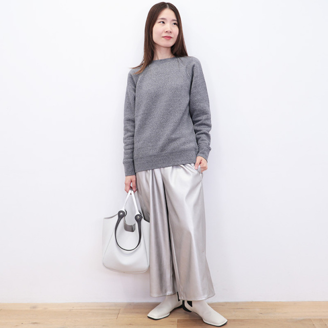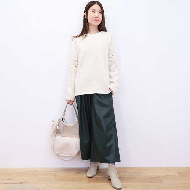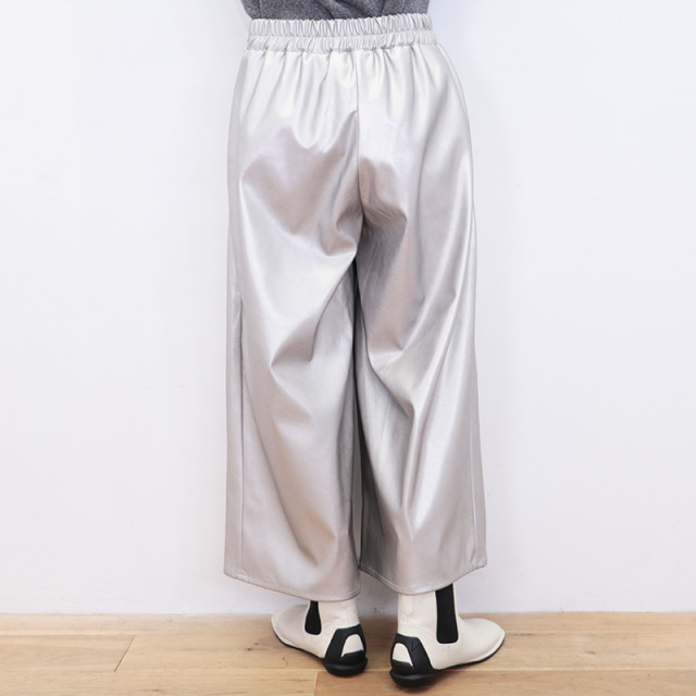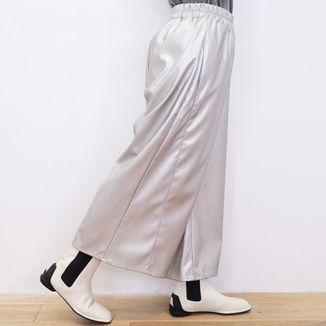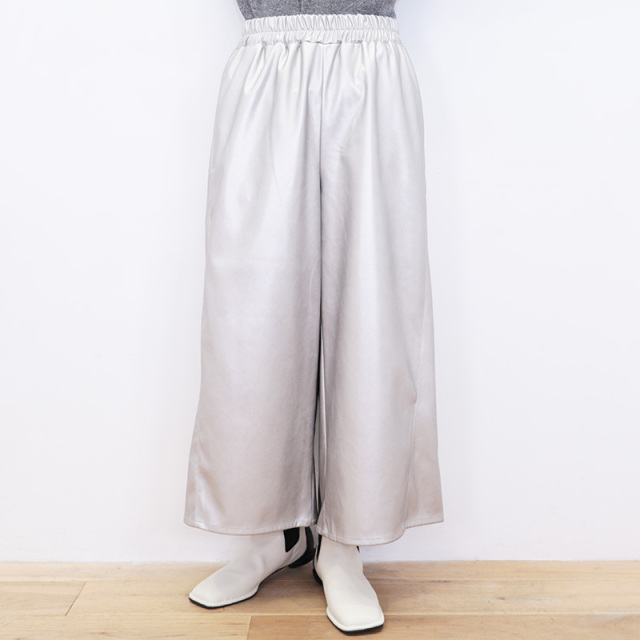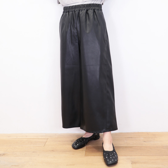 ソフトなエコレザー素材のワイドパンツ。サイドのラインを少し前側に倒しており、動きがつけられています。ワイドシルエットにして重たさはなく、秋冬のニットによく似合います。ウールニットなどの毛羽が付きにくく、イージーケアなのも嬉しいポイントです。ウエストはゴム+コンシールファスナー仕様で穿きやすくなっています。ややマット感のあるツヤが特徴で、ハードなイメージよりも上品に着用でき、秋冬の日常コーデに大活躍間違いなしです。