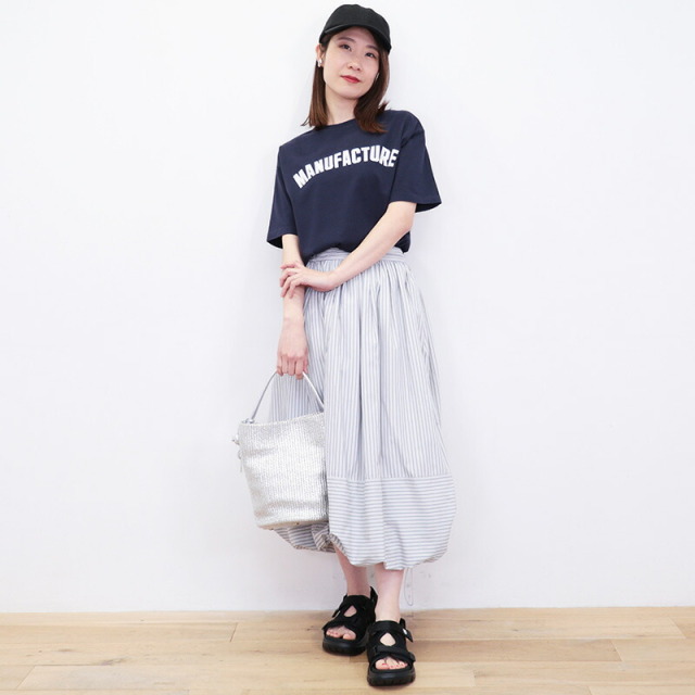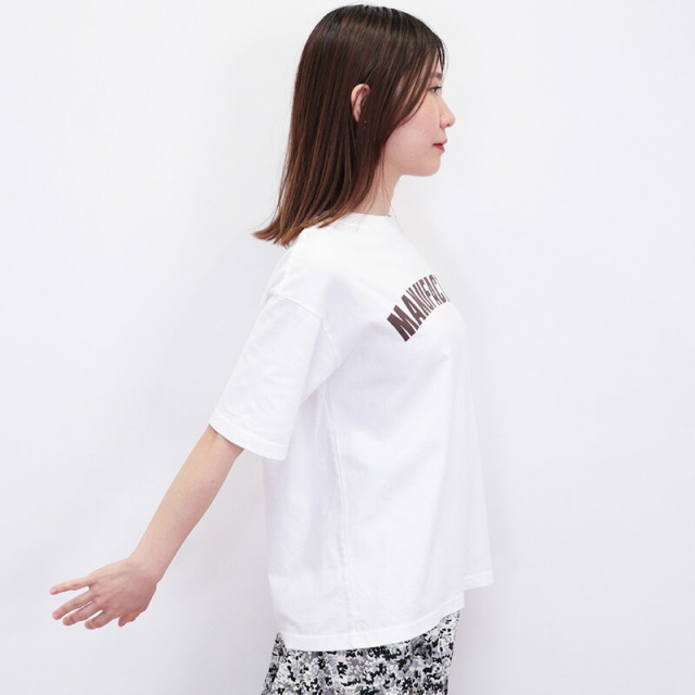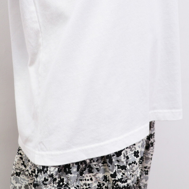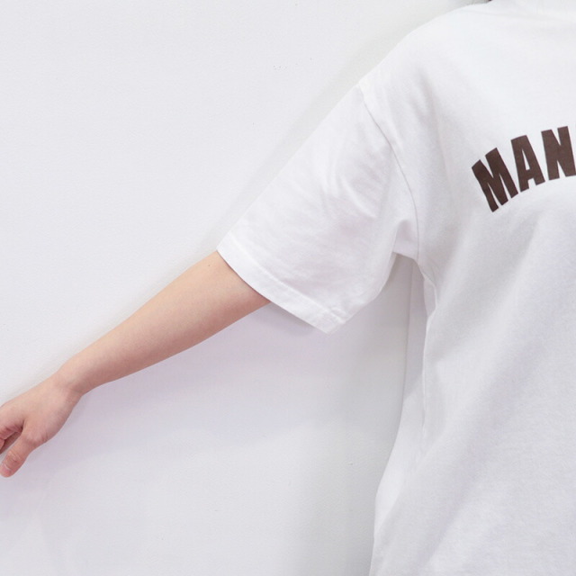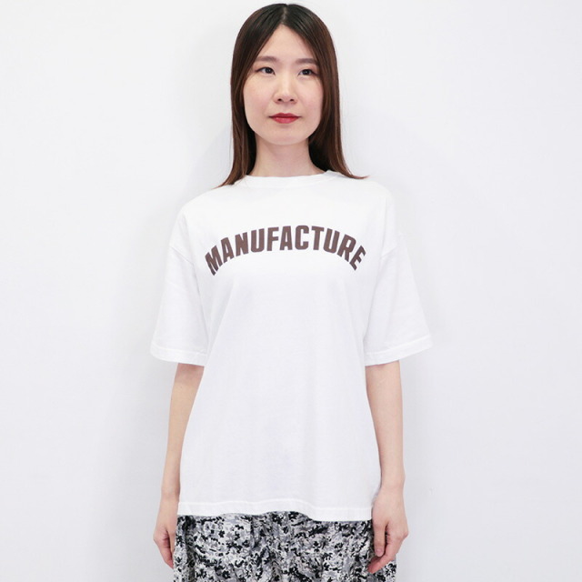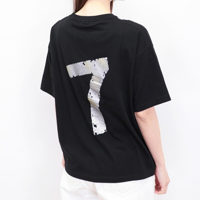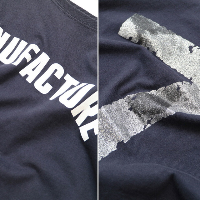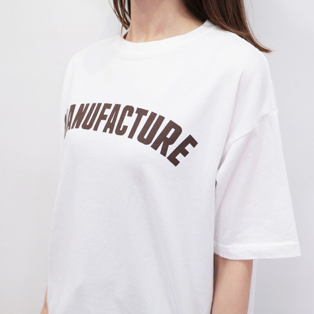 シンプルな中にも丁度良くデザインのあるロゴTシャツ。フロントの「MANUFACTURE」はプリントにひび割れ加工を施し、バックは数字の「7」にグリッターインクミックス加工を施しています。適度な厚みのあるコットン生地はハリがあり、オーバーサイズなところも相まって身体のラインを拾わず、Tシャツがしっくりこない方にも挑戦して頂きやすいアイテムに仕上がっています。