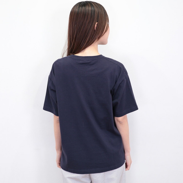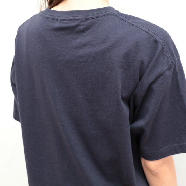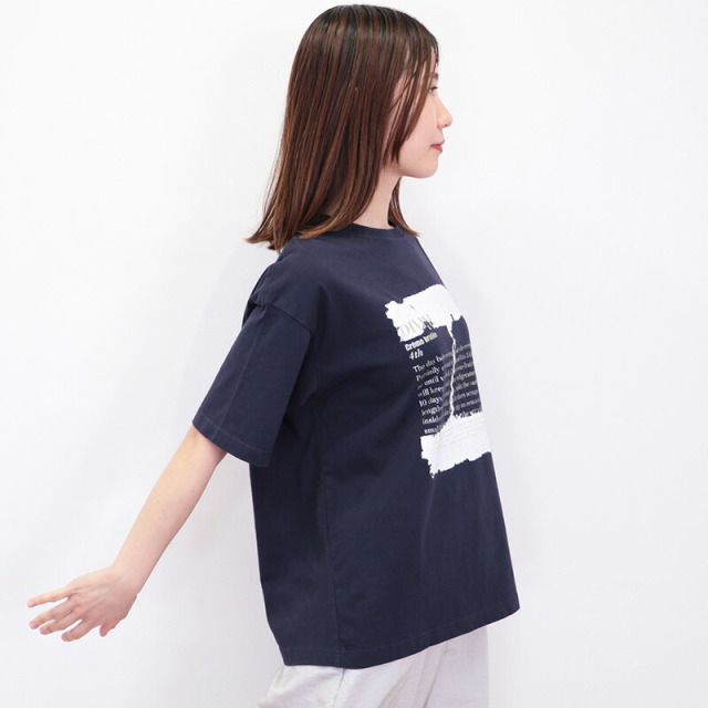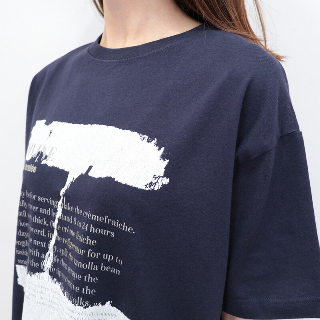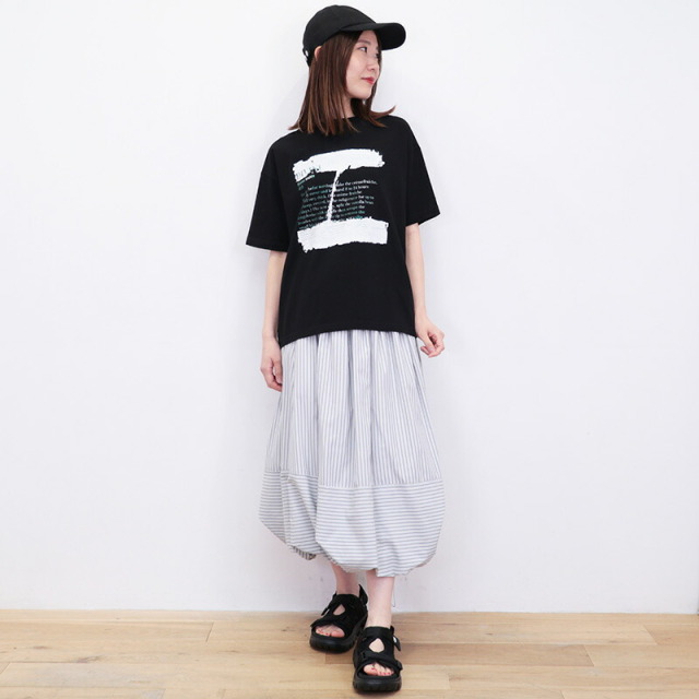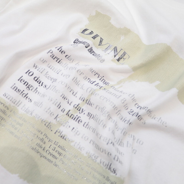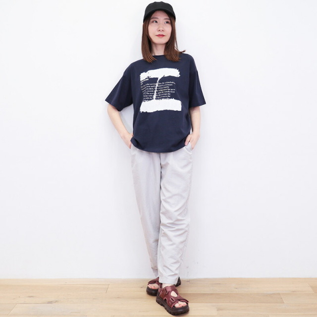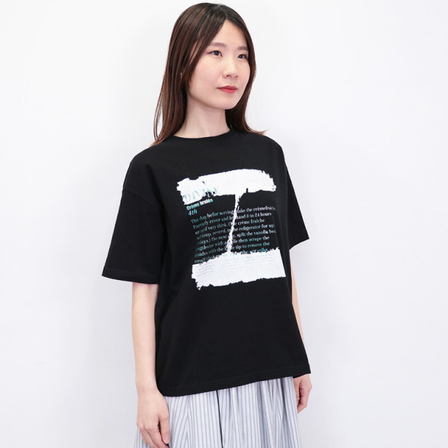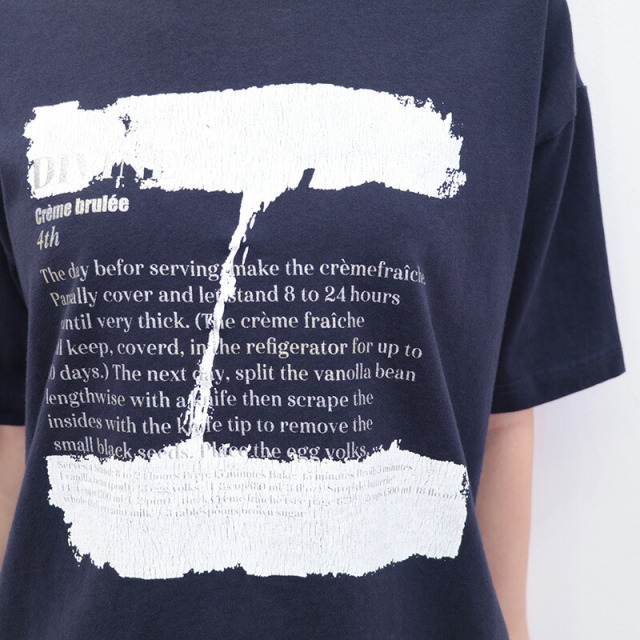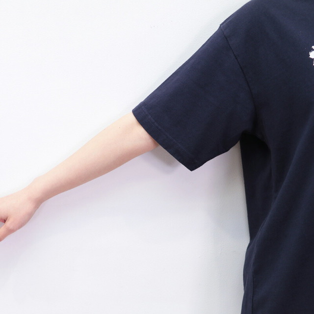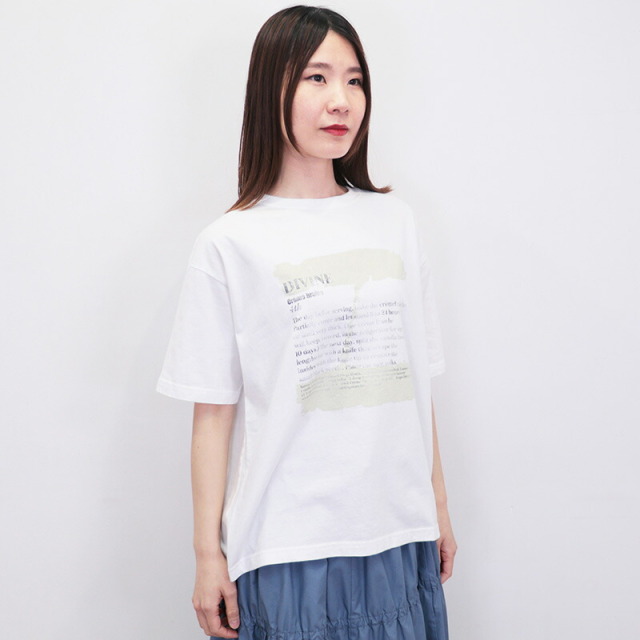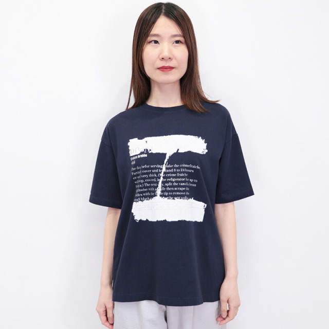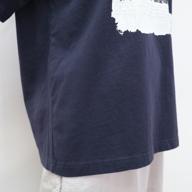 さりげなくグリッターが輝くプリントTシャツ。モチーフにはひび割れプリント、文字部分にはグリッターのミックスインクを使用し、手作業で刷っています。プリント後に更に洗いをかけ、よりリアルなひび割れ感を出しました。適度な厚みのあるコットン生地はハリがあり、オーバーサイズなところも相まって身体のラインを拾わず、Tシャツがしっくりこない方にも挑戦して頂きやすいアイテムに仕上がっています。