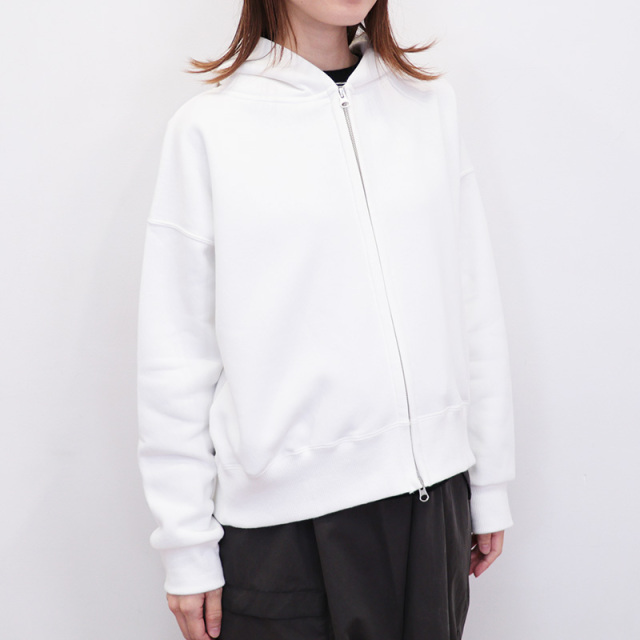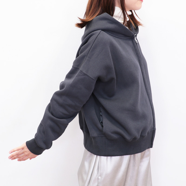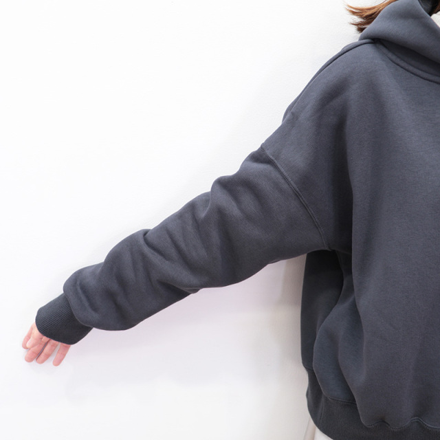 着心地がとても軽やかな裏起毛仕立てのスウェットパーカー。 内側は毛布のように肌あたりがなめらかで、ヒヤッとせず秋冬に嬉しい仕様です。 ドロップショルダーで肩まわりは楽々させながら、裾・袖口にギャザーを寄せ、さりげなくコンパクトにまとまるシルエットを計算しています。 立体的で形の綺麗なフード、フードの中央とポケットに施されたシルバーのステッチがアクセント。また、ポケットの内側はさりげなく光沢がのぞくサテン生地で、上品な一面も。 スッキリと綺麗目にも見えるソリッドカラーで、スウェットでも綺麗めに着ていただけます。