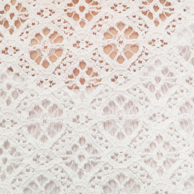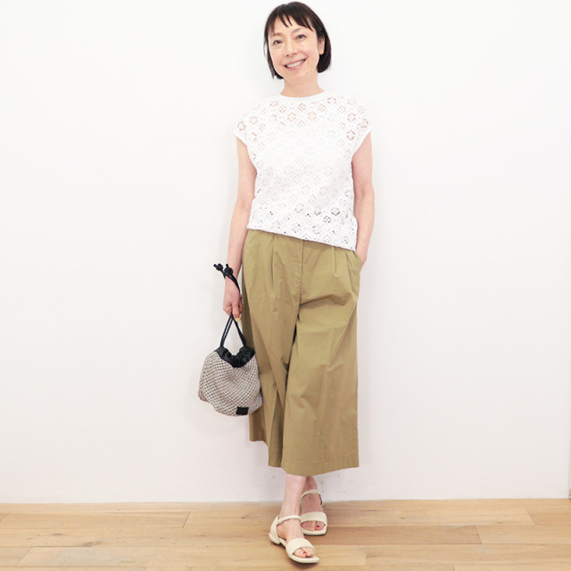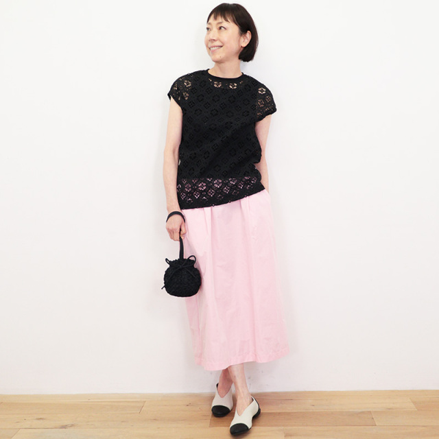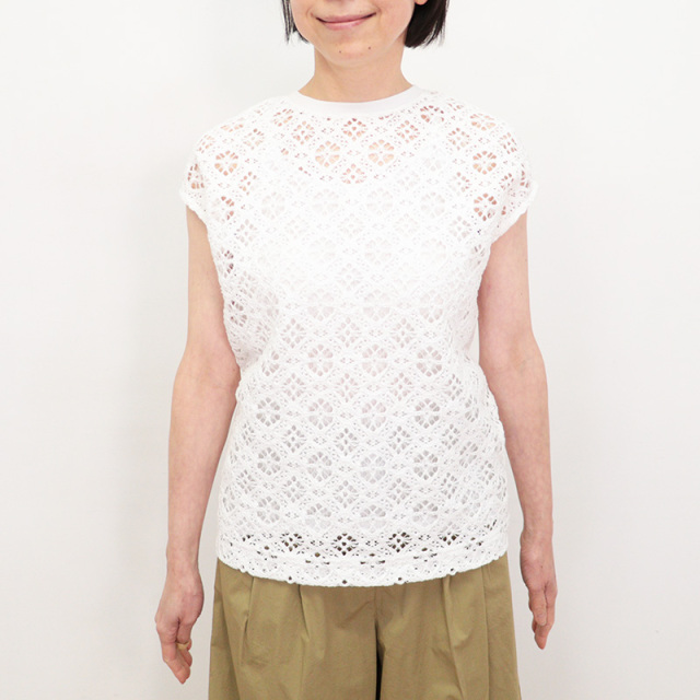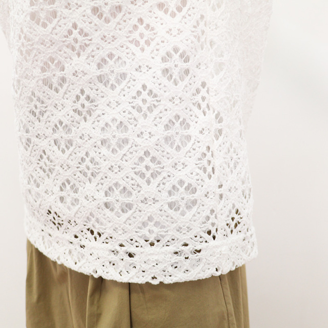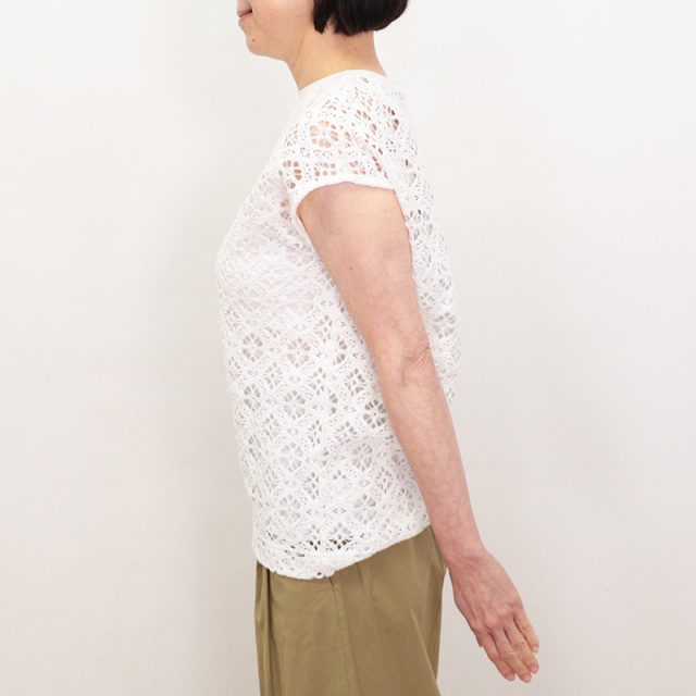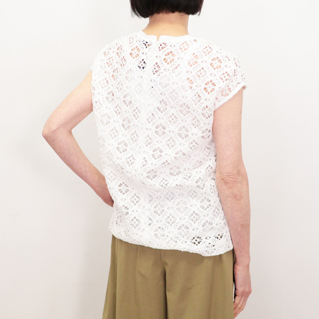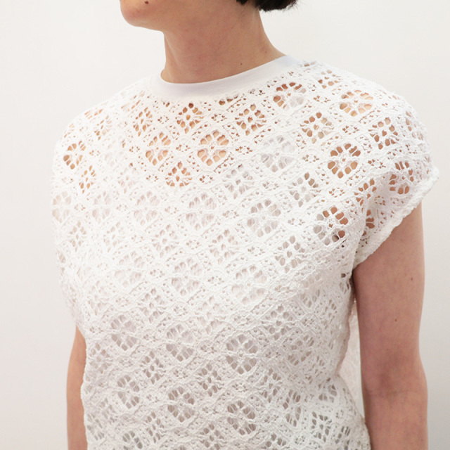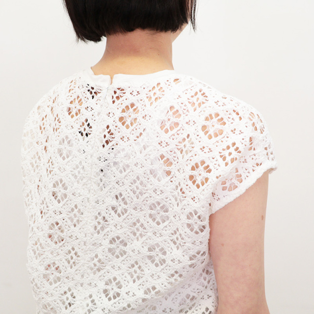 Tシャツの襟元で、身頃はレースという、スポーティさと華やかさを組み合わせたベストセラーアイテム。 今年も、レースのデザインやディテールを変えて登場しました。 今回は日本製のレース生地を使用。あたたかみのある立体感が魅力です。 去年のレースより張りがあるので繊細過ぎず、身体のラインを拾わない強さがあります。 後ろはファスナー仕様できちんと感アップ。ブラウスとして、セレモニージャケットのインナーにもおすすめです。