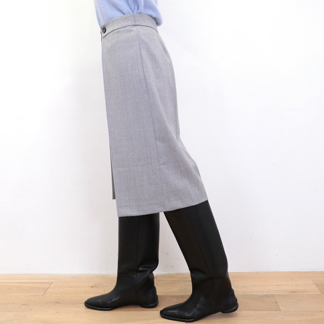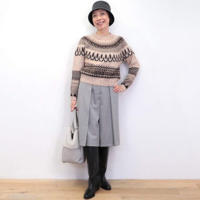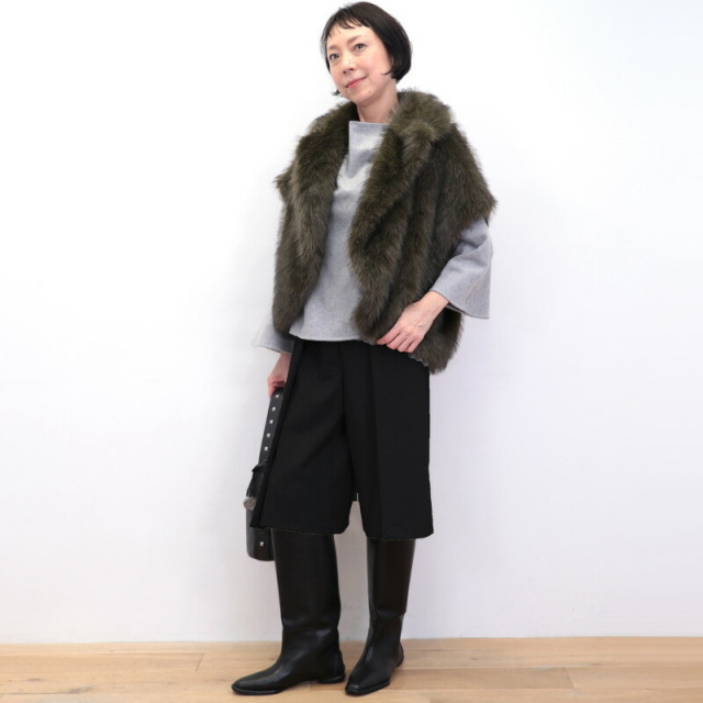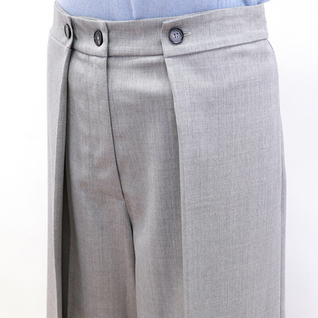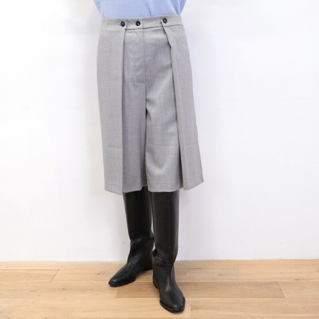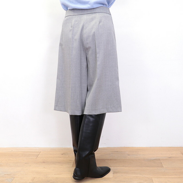 秋冬コーデをワンランクアップさせてくれる上級者アイテムのキュロットパンツ。膝が出ず、ロングブーツとつながる絶妙なバランスの丈感なので、意外にも日常に取り入れやすくなっています。フロント両サイドのボタン一から広がるタックは裾にかけて畳まれており、腰幅やヒップ、足さばきに合わせて自然に広がり動きやすくなっています。ウール混のサキソニー素材できちんと感があり、カジュアルになり過ぎないところがポイント。モードにもトラッドにもコーディネートが楽しめる個性的なアイテムです。