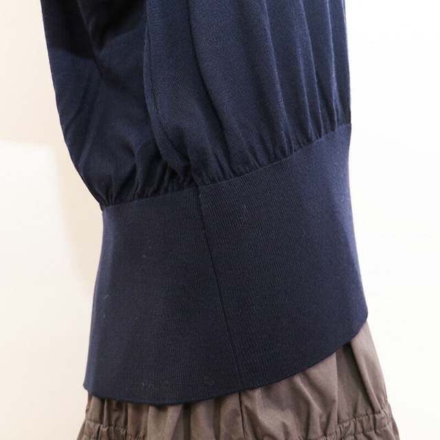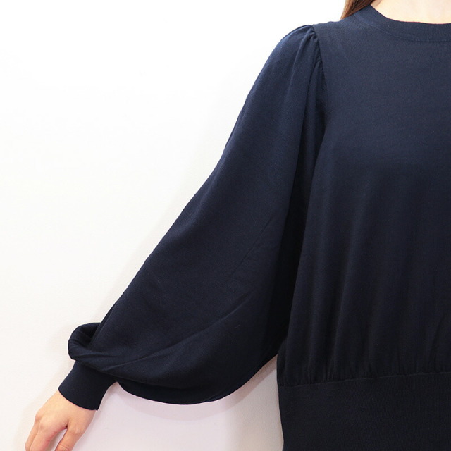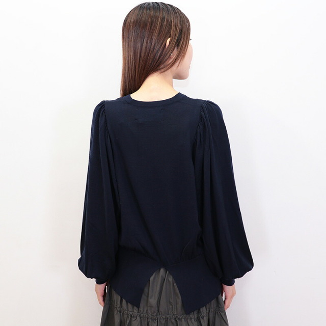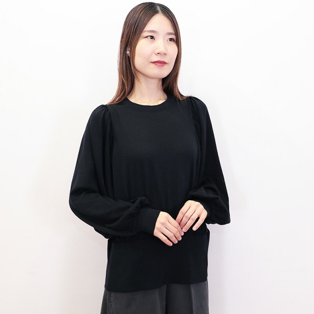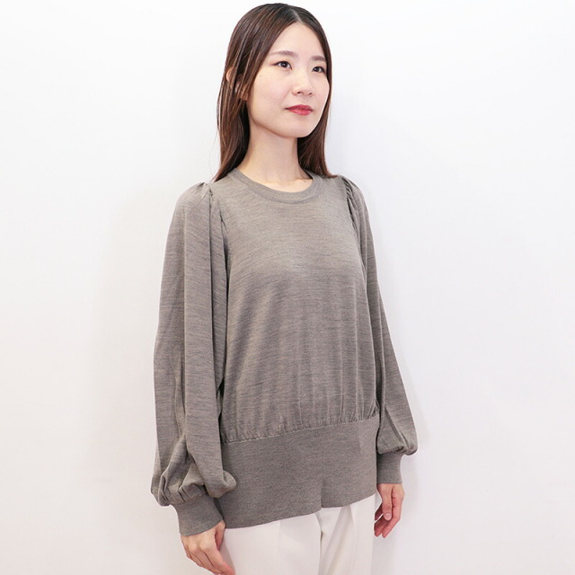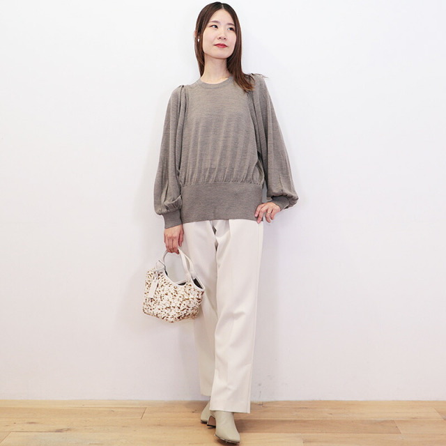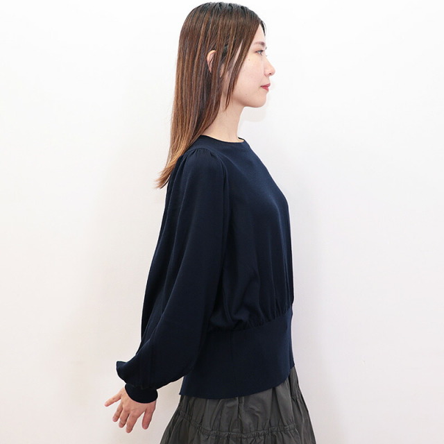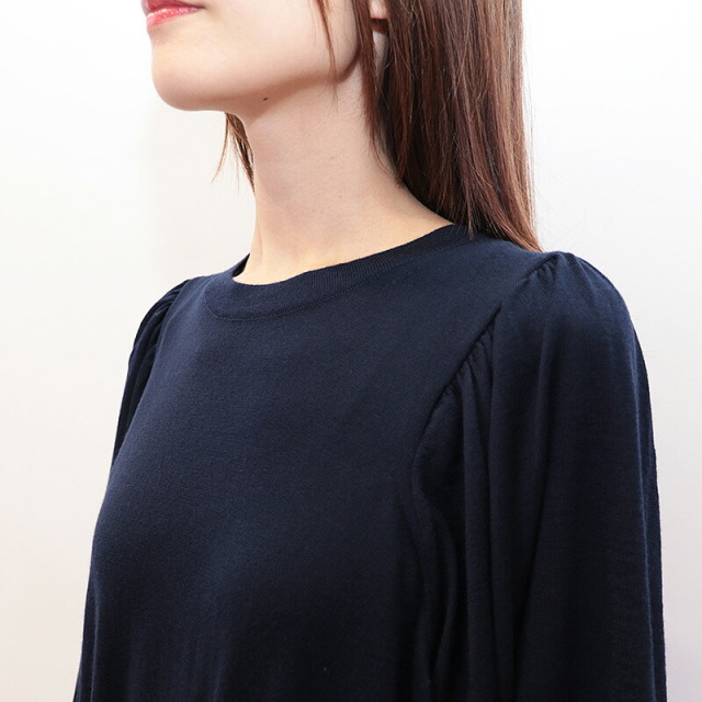 繊細なウール糸を100%使用したハイゲージニット。オーストラリア産、スーパーエクストラファインメリノの中でカシミヤに続く厳選された細い繊度のウール糸を使用しています。編み組織は1インチ間(2.54cm)に編み針が18本入っている、ニットでは希少性の高いハイゲージ。繊細な表情で、美しい光沢と存在感を演出します。内側から入ったギャザーは肩幅を問わずボディを華奢に見せてくれます。袖や裾のキュッとしたリブでメリハリが生まれ、ブラウスの様な立体感が生まれています。スイッチシーズンに一枚で着映えする主役ニットです。