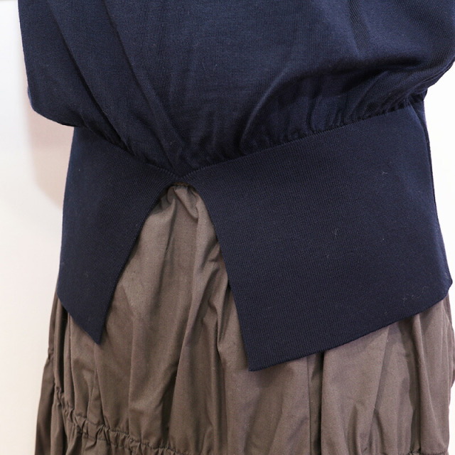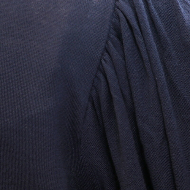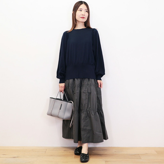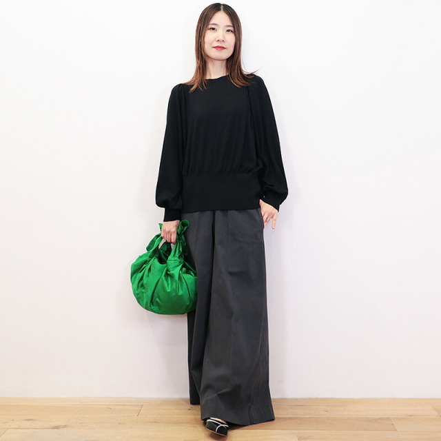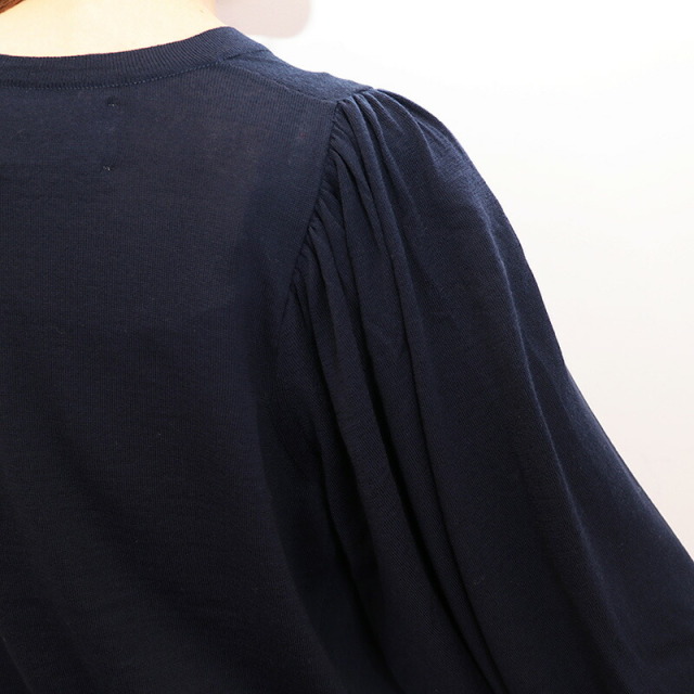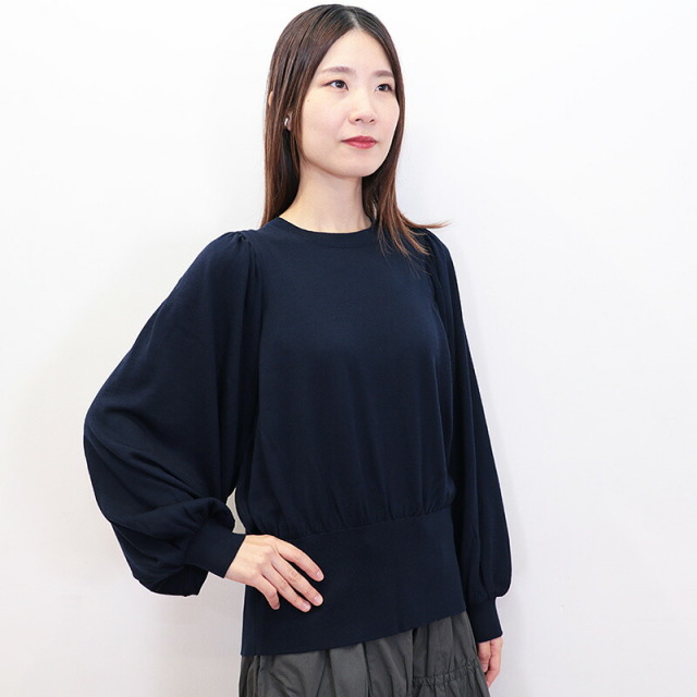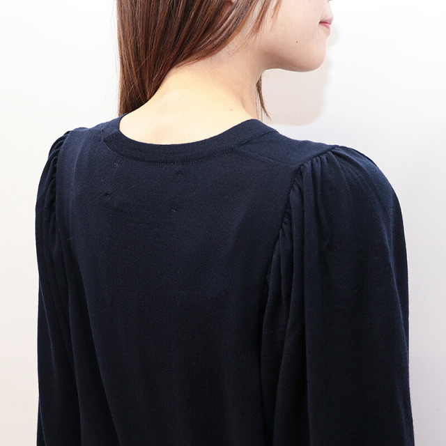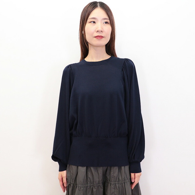 繊細なウール糸を100%使用したハイゲージニット。オーストラリア産、スーパーエクストラファインメリノの中でカシミヤに続く厳選された細い繊度のウール糸を使用しています。編み組織は1インチ間(2.54cm)に編み針が18本入っている、ニットでは希少性の高いハイゲージ。繊細な表情で、美しい光沢と存在感を演出します。内側から入ったギャザーは肩幅を問わずボディを華奢に見せてくれます。袖や裾のキュッとしたリブでメリハリが生まれ、ブラウスの様な立体感が生まれています。スイッチシーズンに一枚で着映えする主役ニットです。