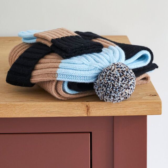 ROBERT MACKIEロバートマッキー 1845年スコットランドで設立した帽子・スカーフのメーカー。創業者のロバート・マッキーが、スコットランドの伝統的な帽子、『バルモラル ボンネット』(ポンポンつきのベレー帽) を作るために創業しました。スコットランド南西部、クライド湾の海岸に位置する歴史ある街エアシャーの豊かな繊維遺産を活用し、丁寧に色鮮やかなニットウェアを作っています。