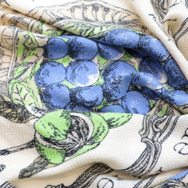 素材には全てインド製のウール60%シルク40%の特注生地を使用しております。プリントの加工はシルクスカーフのプリント技法と同様にインドの職人によって1枚ずつ丁寧に手捺染されています。柔らかく薄手で大判なストールは、使うほど肌に馴染み、長年お使いいただけるアイテムです。フワッと巻いたり、肩に掛けたりとアレンジ自在。重くなりがちな秋冬のスタイリングを華やかにしてくれます。