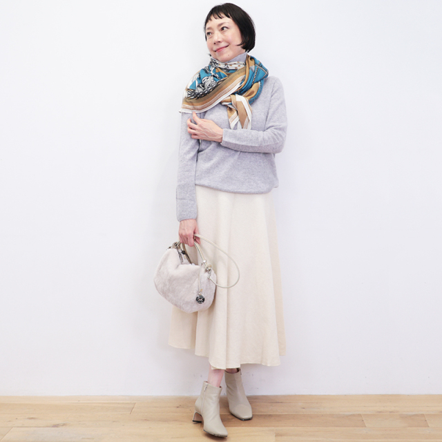 素材には全てインド製のウール60%シルク40%の特注生地を使用しております。プリントの加工はシルクスカーフのプリント技法と同様にインドの職人によって1枚ずつ丁寧に手捺染されています。柔らかく薄手で大判なストールは、使うほど肌に馴染み、長年お使いいただけるアイテムです。フワッと巻いたり、肩に掛けたりとアレンジ自在。重くなりがちな秋冬のスタイリングを華やかにしてくれます。