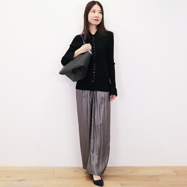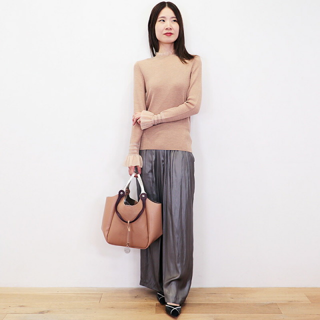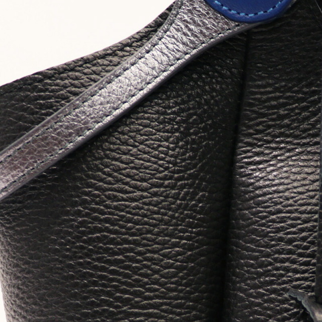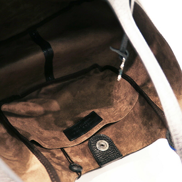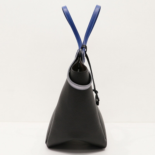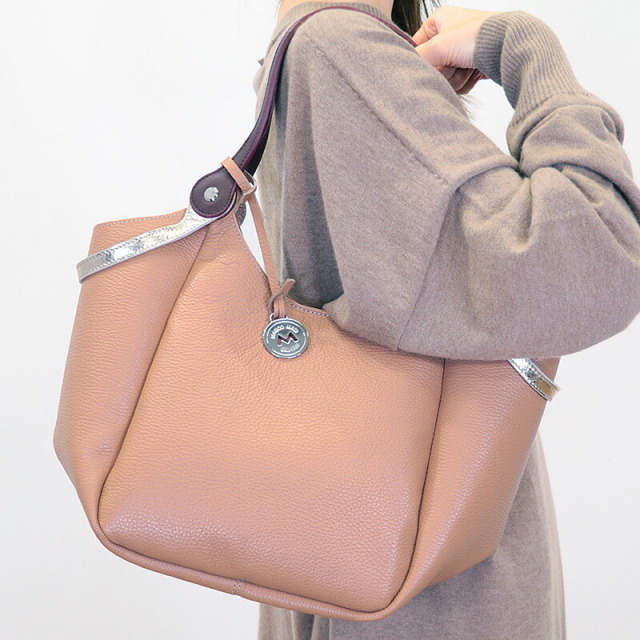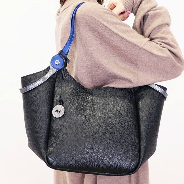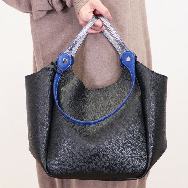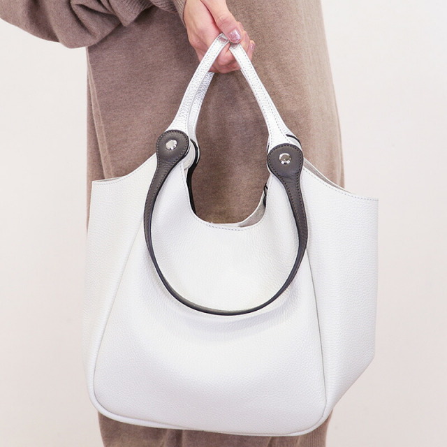 ハンドルを二通りで使えるトートバッグ。二つのハンドルの付け根は回転するようになっており、一方を持つと一方が自然に下がります。ハンドルにはメタリックと締め色のアクセントカラーが使われており、バッグ全体のカラーが単調にならず、コーディネートのポイントにもなっています。ベースはシボ感のある表面が特徴の軽量なレザーを使用しています。まちが大き目で、スッキリとした見た目の割には沢山のものを入れることが出来ます。
