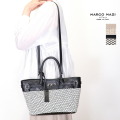 レザーと金具を使ったディティールで高級感の感じられる新モデルが登場。メインはラフィア調素材を使うことで軽量化しながら、きちんと感をアピールできます。底は足つきで自立し、形がしっかりとついているため、物の出し入れもしやすくなっています。取り外し可能なショルダーストラップも付属しています。