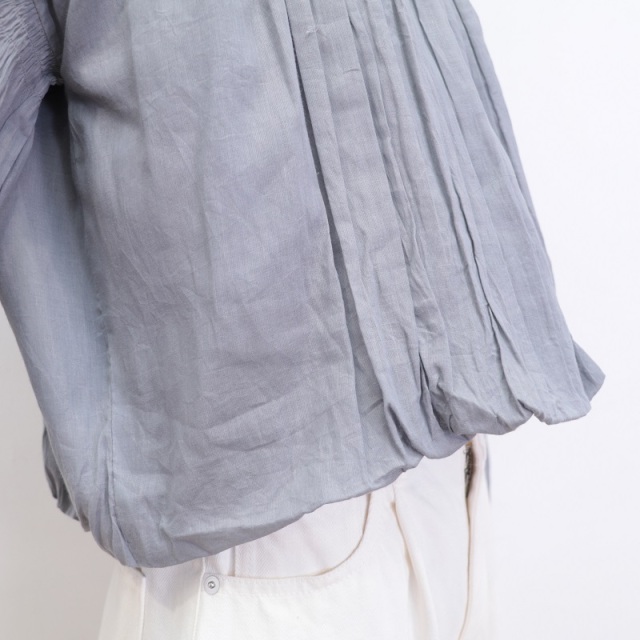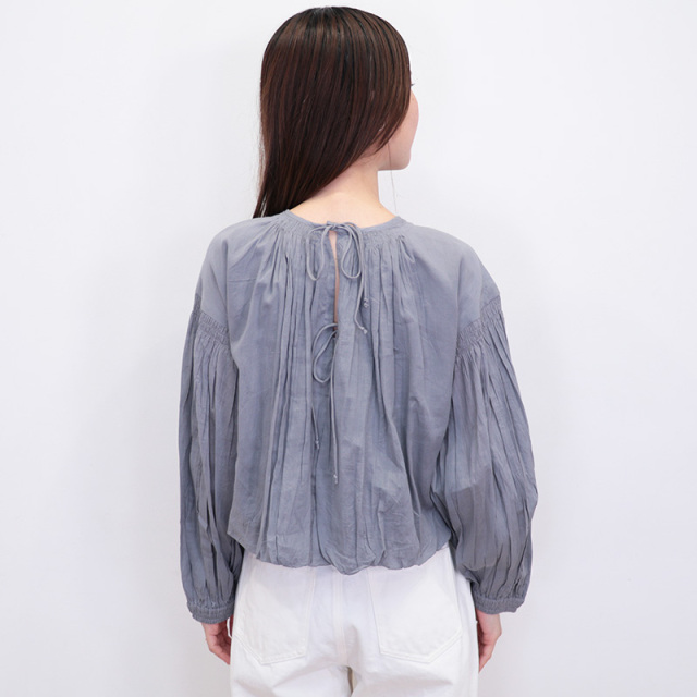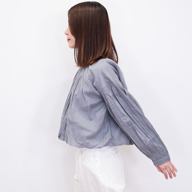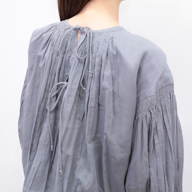 ギャザーを寄せた生地をネック部分に糊付け(スターチド加工)し、高級感のあるディティールで仕立てたブラウス。透け感のあるコットンボイル生地を、シャーリングとたっぷりのギャザーを寄せてバルーンシルエットになるようデザインしています。インドならではの職人技で仕上げたシャーリングギャザーが魅力。