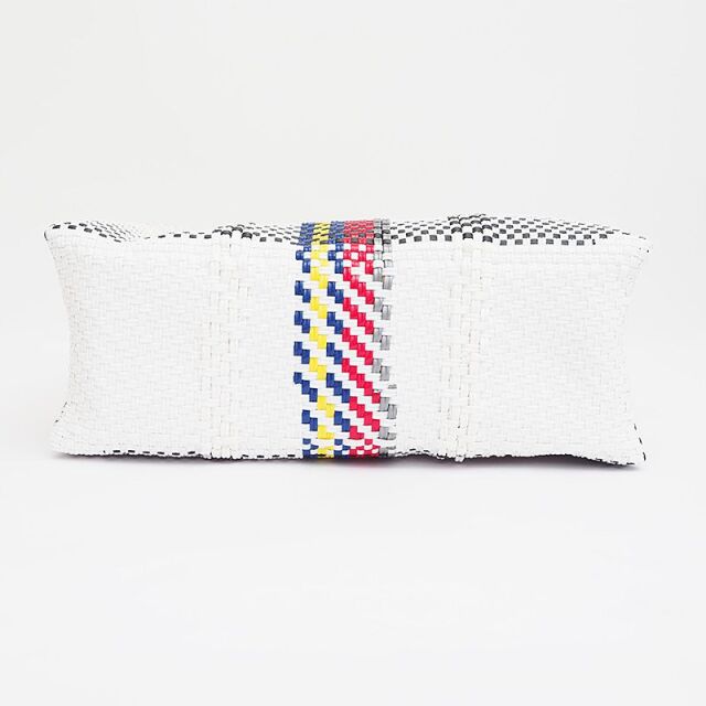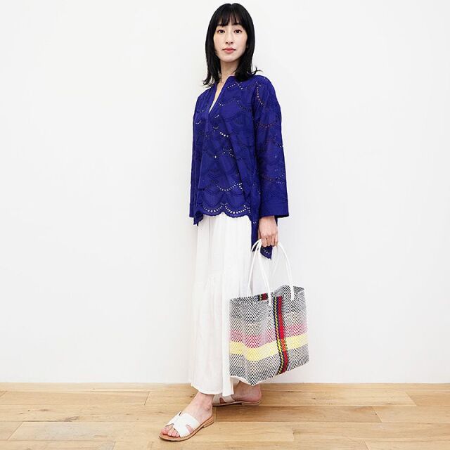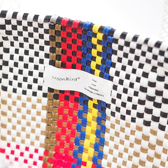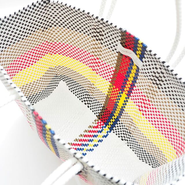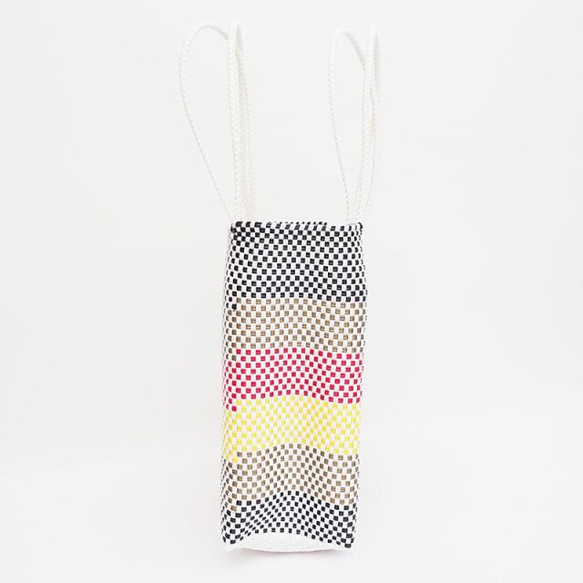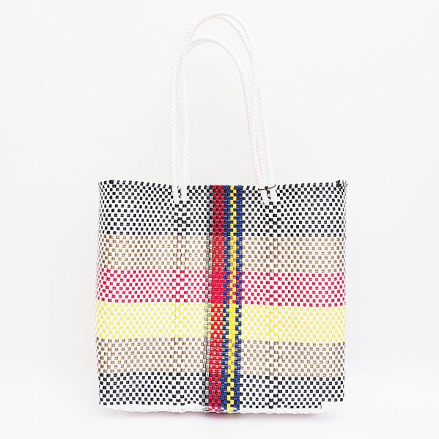 ペットボトルから再利用されたリサイクルプラスチックのメルカドバッグ。こちらはお買い物や習い事、旅行といった幅広い用途に便利なLサイズ。スッキリとした都会的な配色で、日常のコーデに馴染みながらアクセント使い出来るデザインです。間口が広いので荷物が入れやすく、丈夫なプラスチック紐を使用しているので、汚れた際のお手入れも簡単。雨の日の気兼ねなく使えるので、デイリー使いに最適です。環境に配慮しながら、本格的なメキシカンカゴバッグの要素をポイントに取り入れて春夏気分をアップ!