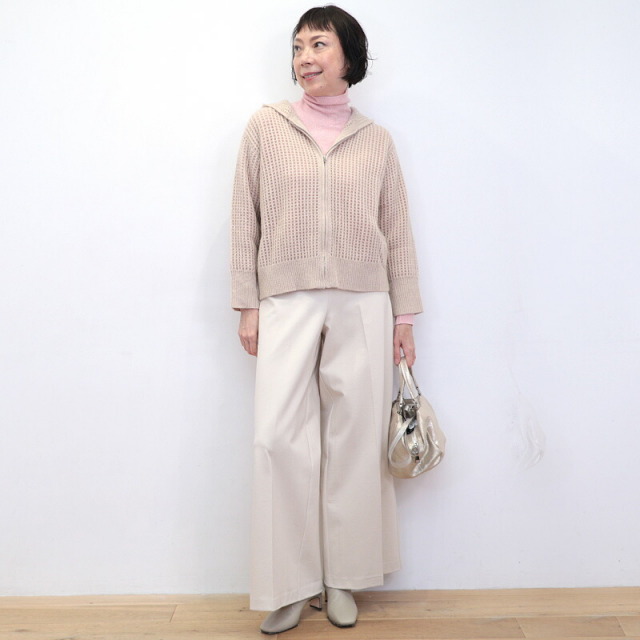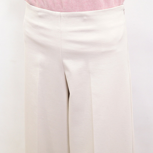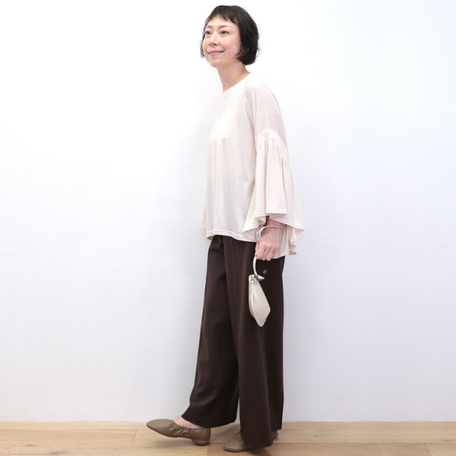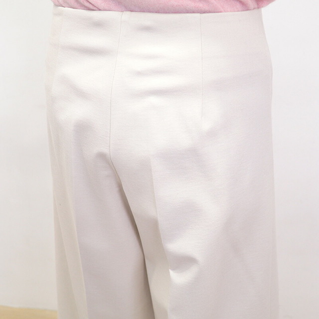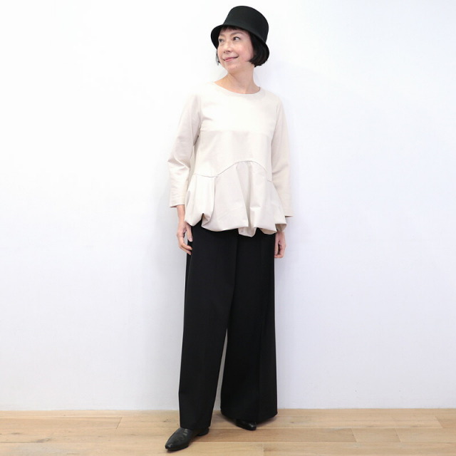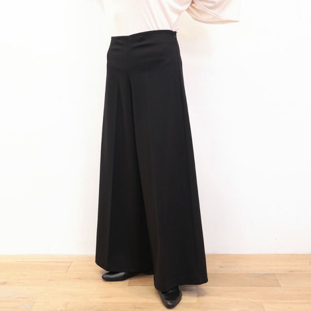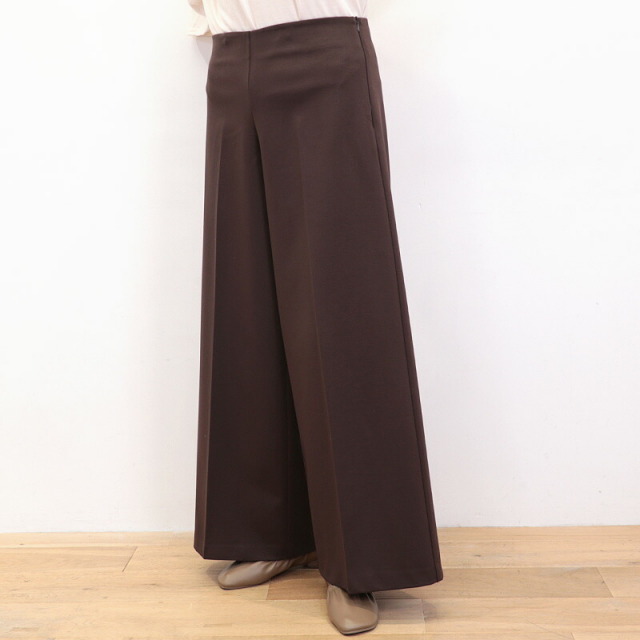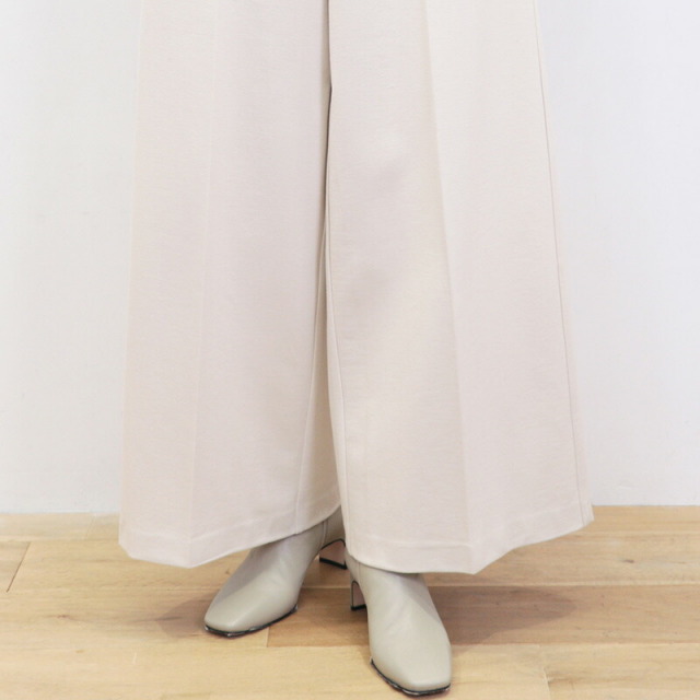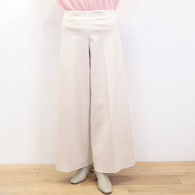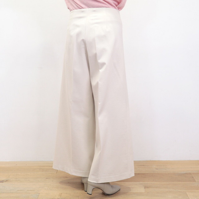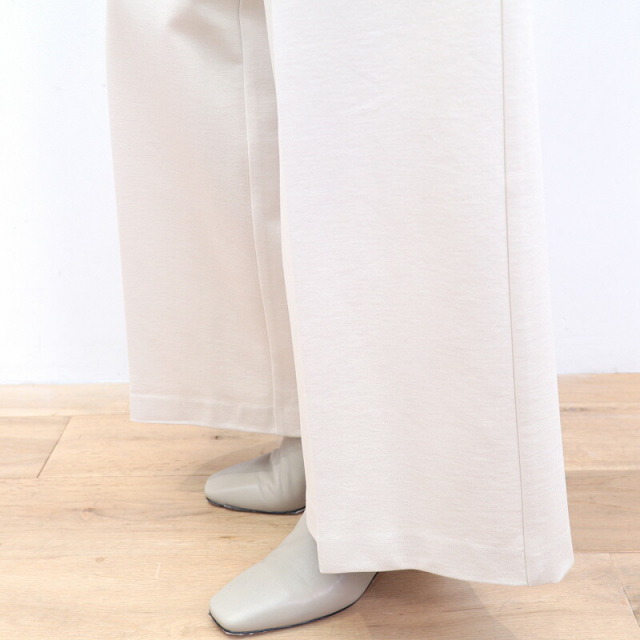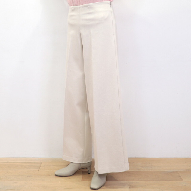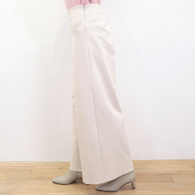 ハリのあるポンチ素材を使用したワイドパンツ。ウエストはサイドファスナーで、厚みを抑えたフラットな仕様。ストレッチ素材でフィット感はあり、腰から下はストンと広がるシルエットにすることで、身体のラインを響かせないよう工夫がされています。綺麗目に見えて着心地と取り扱いは楽々。気軽に穿けて存在感のあるスタイリングが叶います。