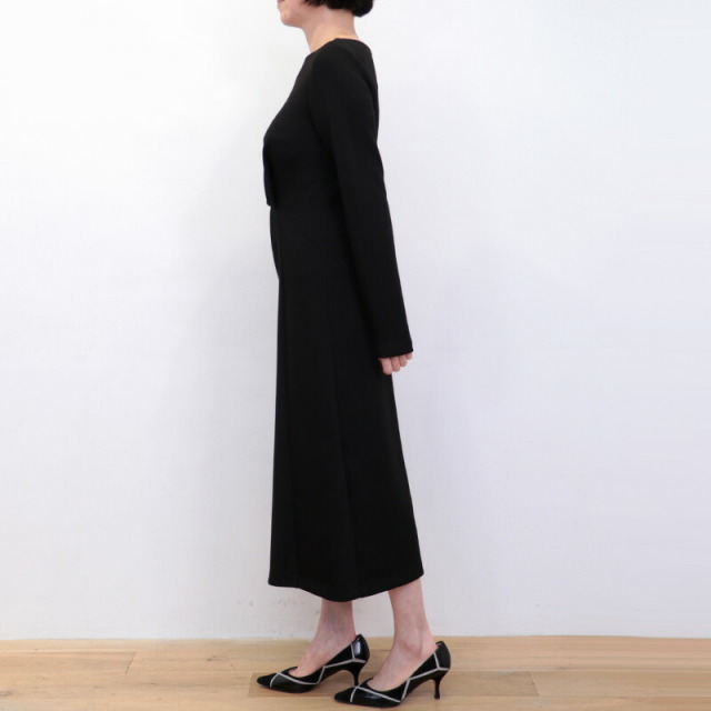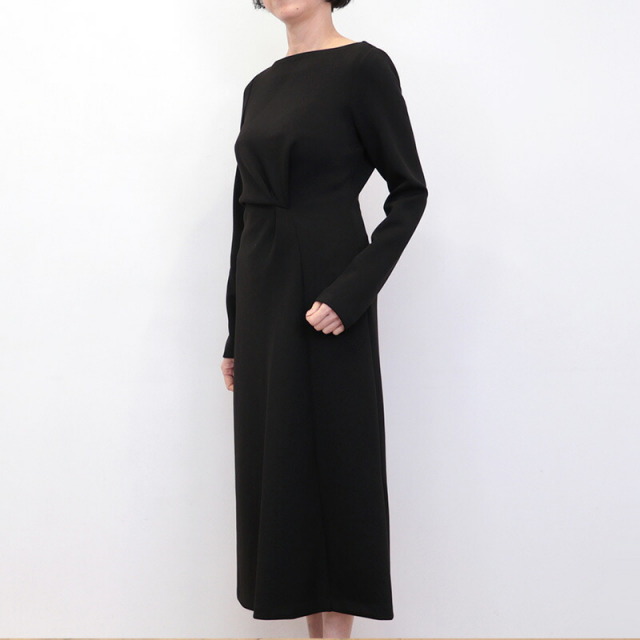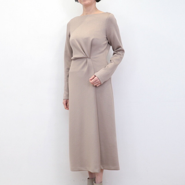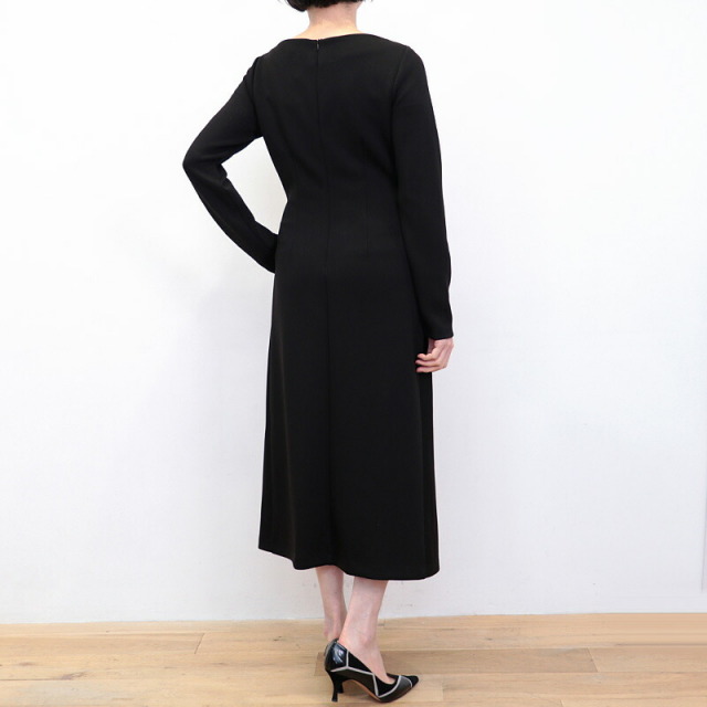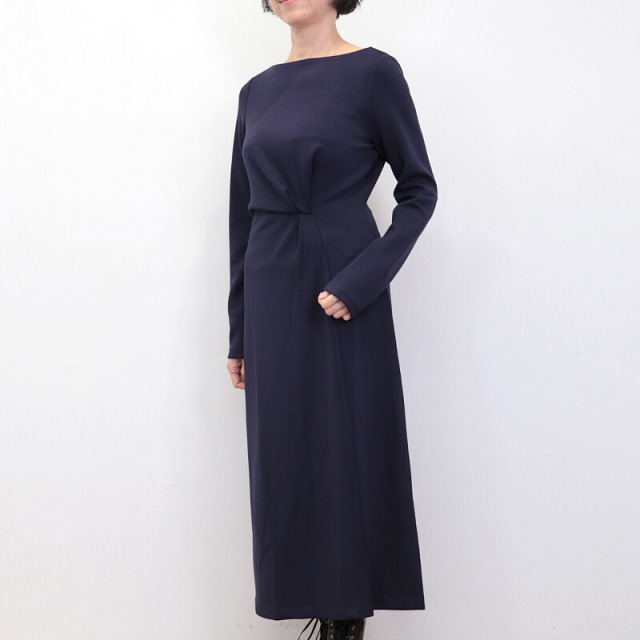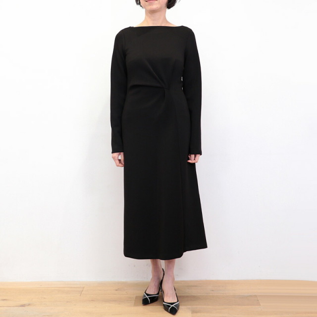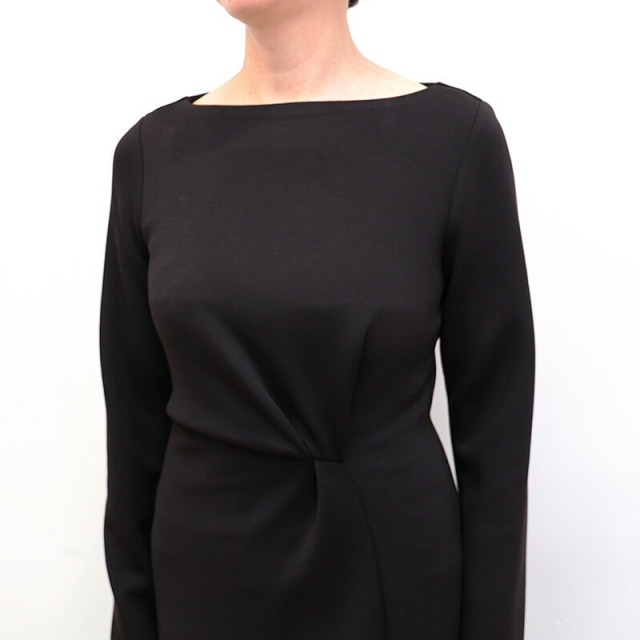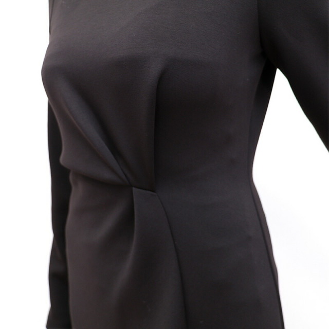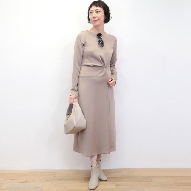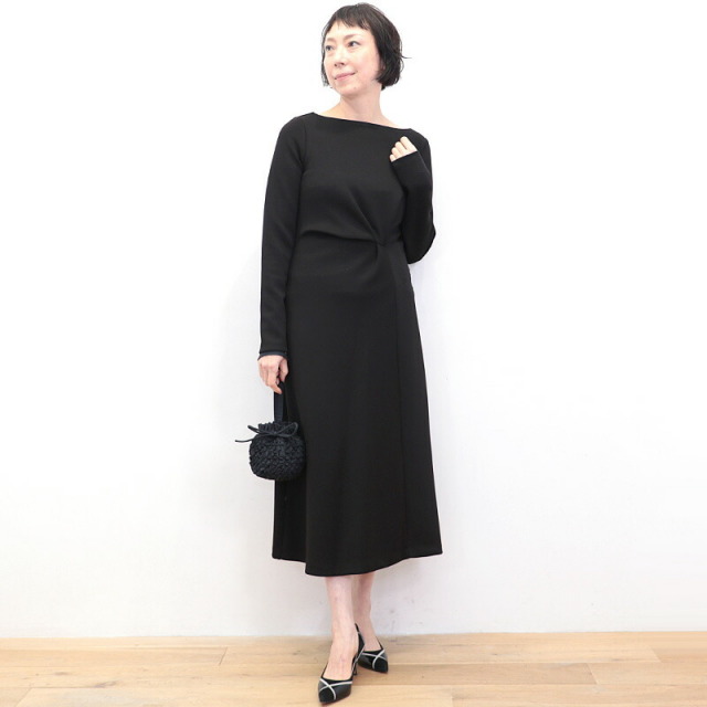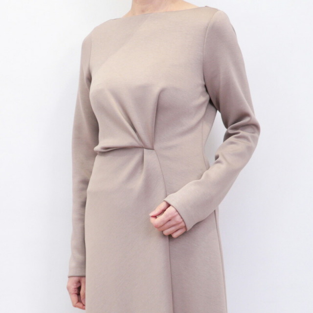 ドレスのように綺麗めなツイストデザインのワンピース。肉厚でスムースな表面感のボンディングジャージ素材は暖かく軽量でありながら、一般的なスウェットよりもカジュアルさが抑えられ高級感のある印象です。ツイスト部分は縫い留めてある為着崩れることなく、デザインにより腰位置が高く見えスタイルアップ効果も抜群。ご自宅で手洗い可能なところも嬉しいポイント。日常にもオケージョンシーンにも頼もしいアイテムです。
