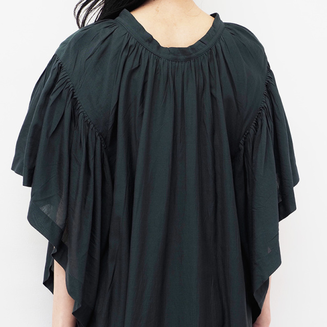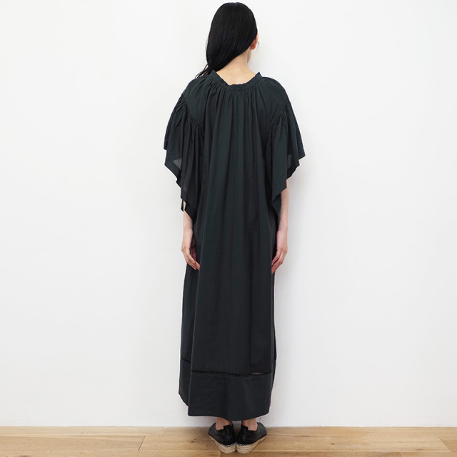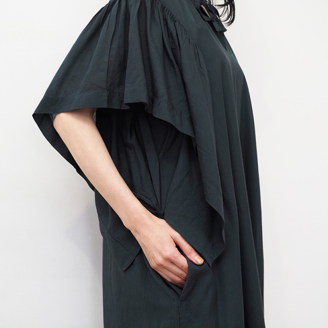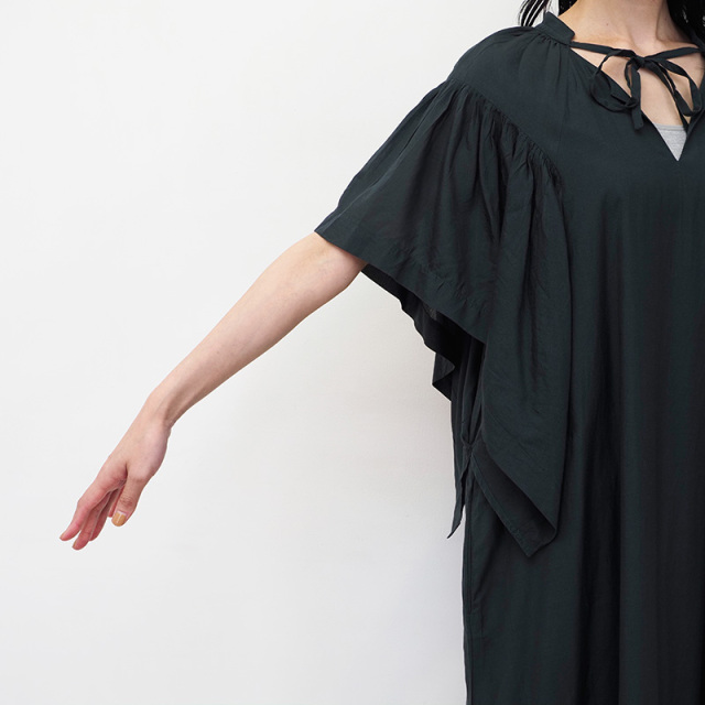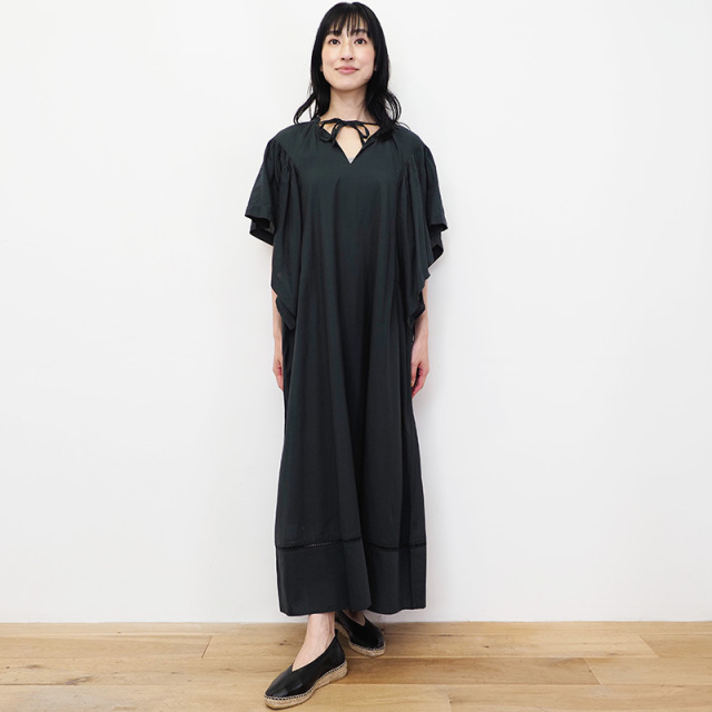 バックと袖にこまやかなピンタックを施し、ドレスライクに仕上げたワンピース。裾にはラダーレースを施し、足さばきで控え目な透けが見られ、涼し気な印象です。身頃は裏地付きで、透ける心配もありません。素材はコットンとレーヨンの混合で、コットン100%よりも落ち感と光沢があり、カジュアルになり過ぎず、綺麗めな印象。サラサラな表面感で、蒸し暑い夏も快適に過ごすことが出来ます。