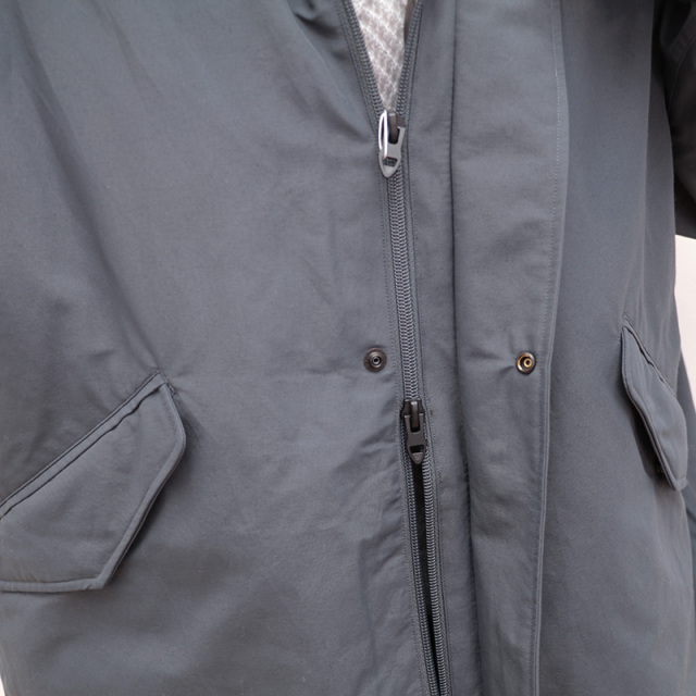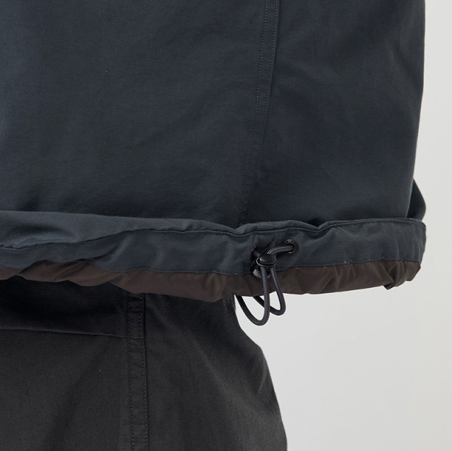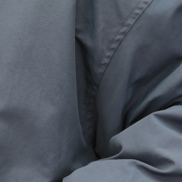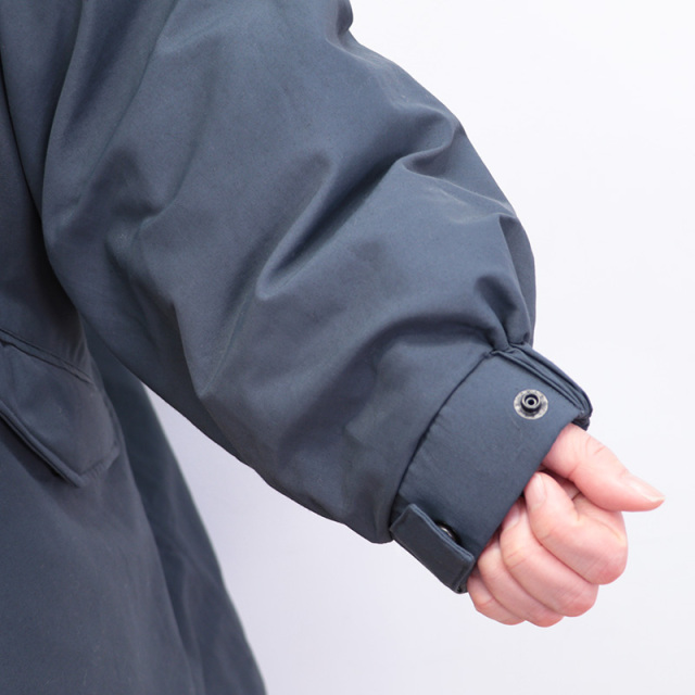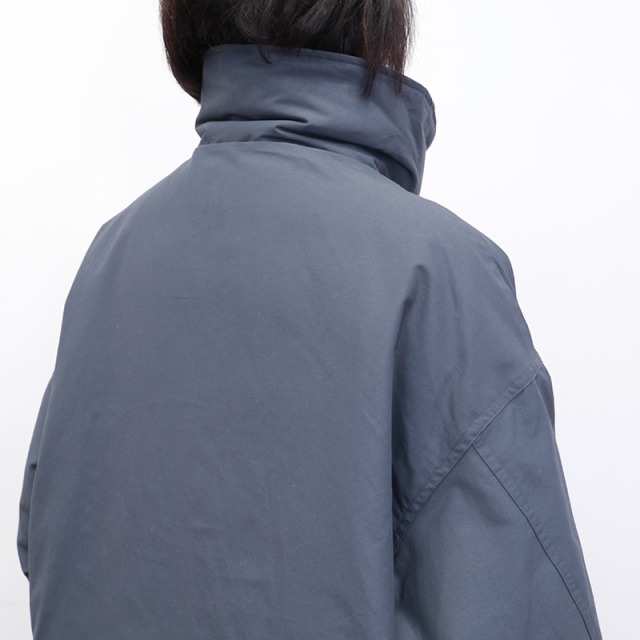 オーガニックコットンとリサイクルナイロンのグログランクロスを使用したダウンコート。クラシックアウトドアスタイルの定番素材グログランクロスを採用しています。 中わたの光電子® ダウンは、人の体からでている遠赤外線(体温)を輻射して、体に戻すことで自然な温かさをキープしてくれる機能性素材。軽量で暖かく、日常使いにとても快適です。更に表地には、はっ水加工を施すことで機能性をプラス。スタンドカラー仕様かつ、首元を温める二重襟仕様、風の侵入を防ぐコードストッパーやゴムシャーリングを袖口や裾に搭載しており、体型や環境に合わせて微調整が可能です。シルエットは身幅にボリュームをもたせたオーバーサイズで、独特の雰囲気がありクールな印象。十分な機能性と存在感のあるアウターです。