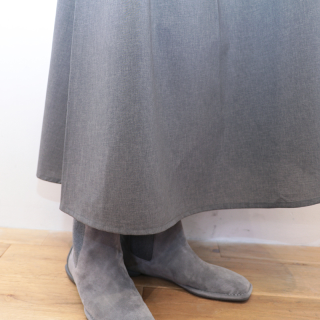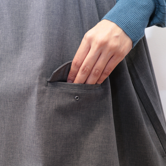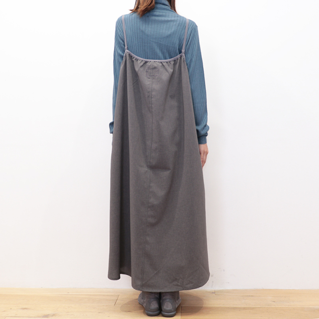 ストレッチ性、速乾性、はっ水性を持ちあわせた機能性素材「ポリエステルトロピカル」を使用したキャミソールドレス。強い撚りを加えたリサイクルポリエステル糸を使用しており、自然なシワ感、リネンライクな風合が表現されています。肌触りはサラッとドライで、蒸し暑い夏にも快適。透け感は無くハリのある生地なので、重ね着次第でオールシーズン着用いただけます。可愛らしくなりがちなサロペットスカートですが、たっぷりとした生地分量と長めの着丈でドレープを作り出すように設計されており、エレガントな印象が感じられます。更に長さ調節可能でゴムのように伸縮する肩紐がストレスフリー。体型やインナーアイテムに合わせて快適にスタイリングが可能です。