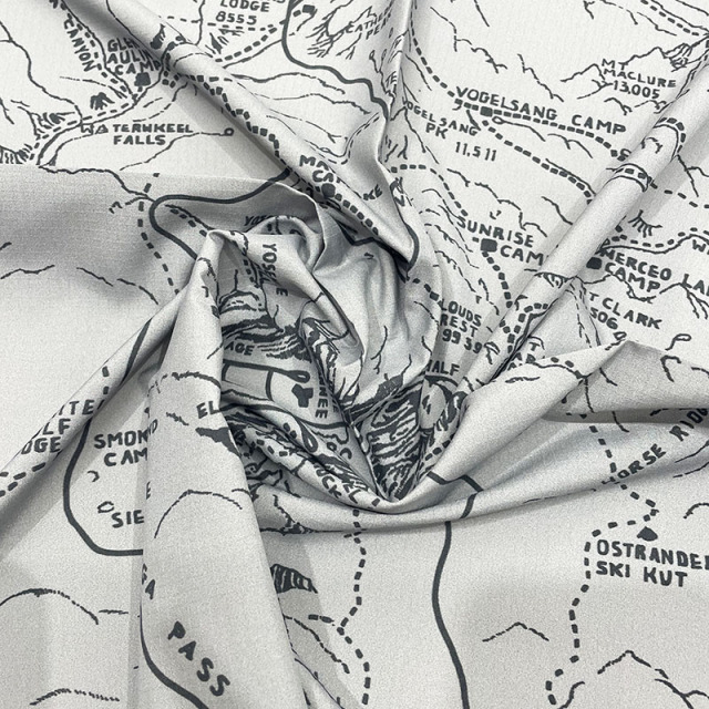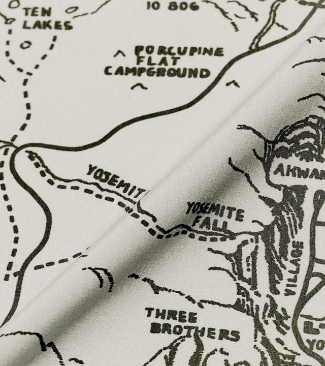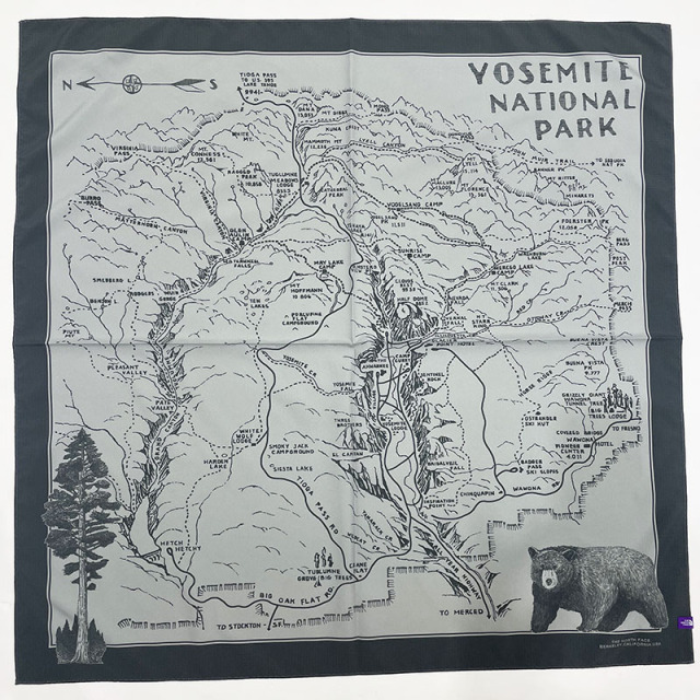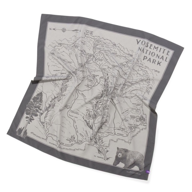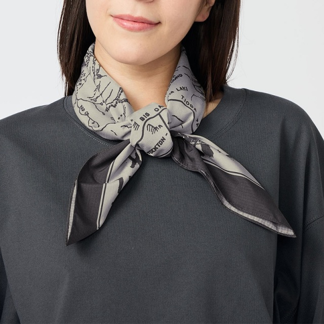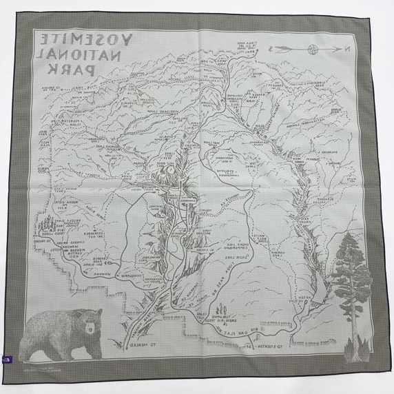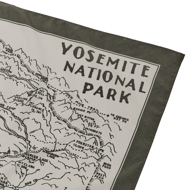 リサイクルポリエステルリップストップ生地を使用したマウンテンスカーフ。ヨセミテ国立公園のガイドマップをイメージしたアートワークをプリントしています。日除けとして首に巻いたり、腰や頭、バッグの持ち手に巻いてアクセントをつけるのもおすすめです。