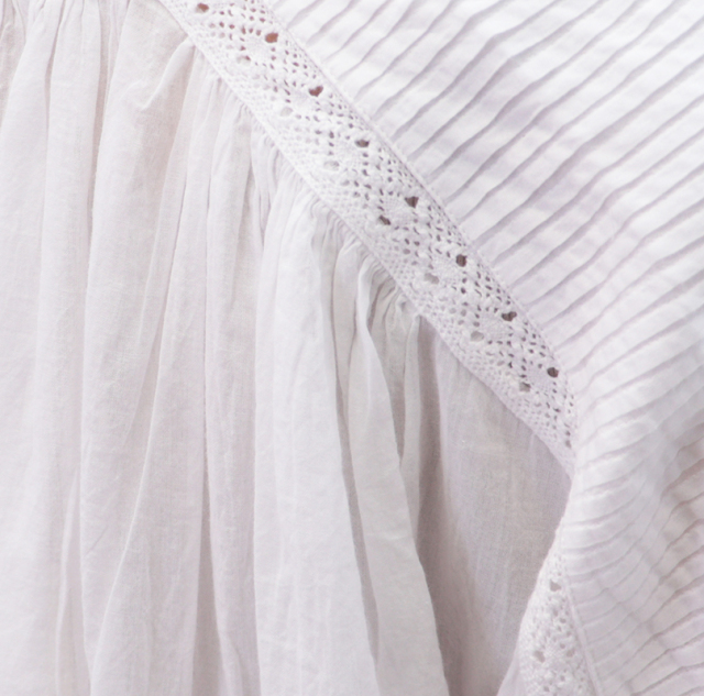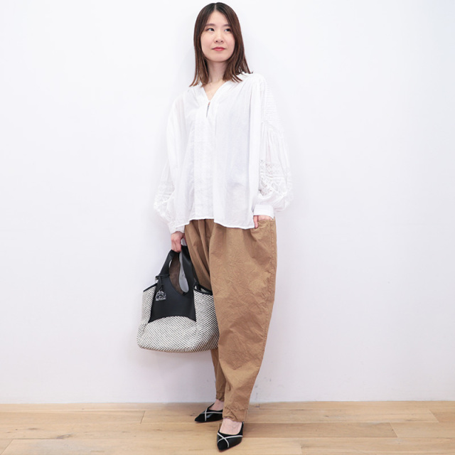 ブランドで大人気のブラウス。トレンドのボリュームスリーブは、肩まわりにあしらった細やかなハンドピンタックがポイント。 さらに繊細なレースで切り替え、軽やかな透け感をプラスしました。前立てにもレースをあしらい、フェイスラインに華やかさを演出。 定番の柔らかなコットンボイル地が肌に心地よく、風通しの良いゆったりシルエットで、真夏まで快適に着こなせます。 気になるヒップラインをカモフラージュしてくれる着丈も嬉しいポイント。