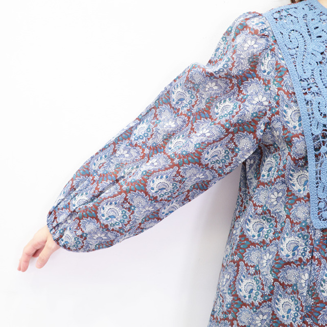 ペイズリーのレース、プリントでエスニック感のあるデザインに仕上げたヌキテパらしいワンピース。色合いはスモーキーで、秋冬まで長く合わせられる配色です。 長めの着丈、裾のティアードや袖口のギャザーなど、シンプルながらディテールをきかせています。素材は通気性の良いインド綿で快適。夏は腕を捲って半袖として着用でき、ベストやブーツを合わせて秋冬コーデも楽しめます。